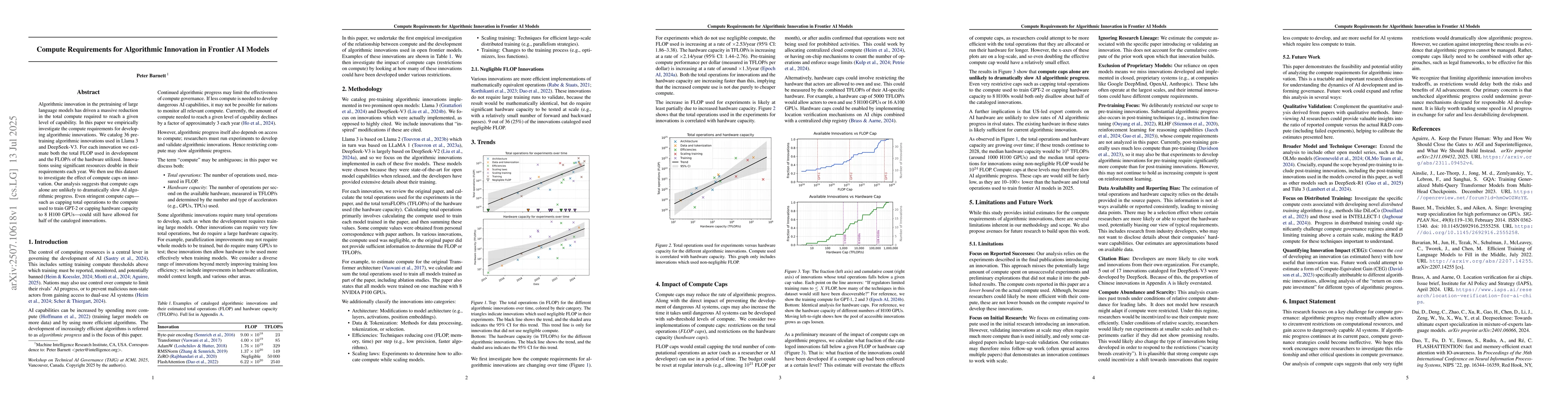 Algorithmic innovation in the pretraining of large language models has driven a massive reduction in the total compute required to reach a given level of capability. In this paper we empirically investigate the compute requirements for developing algorithmic innovations. We catalog 36 pre-training algorithmic innovations used in Llama 3 and DeepSeek-V3. For each innovation we estimate both the total FLOP used in development and the FLOP/s of the hardware utilized. Innovations using significant resources double in their requirements each year. We then use this dataset to investigate the effect of compute caps on innovation. Our analysis suggests that compute caps alone are unlikely to dramatically slow AI algorithmic progress. Even stringent compute caps -- such as capping total operations to the compute used to train GPT-2 or capping hardware capacity to 8 H100 GPUs -- could still have allowed for half of the cataloged innovations.