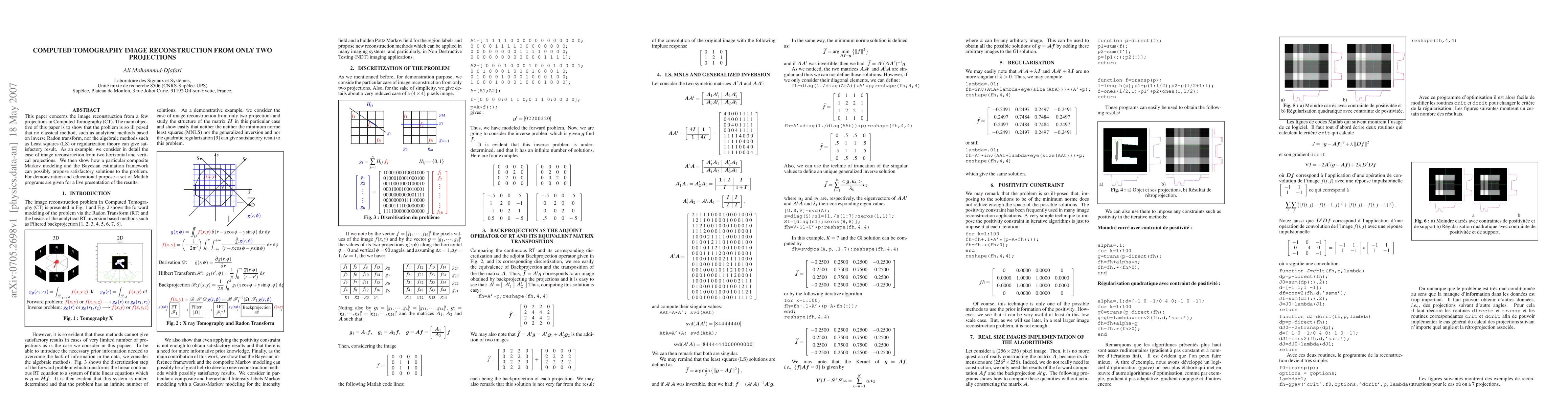 This paper demonstrates that reconstructing images from just two projections in Computed Tomography is an ill-posed problem, rendering classical methods ineffective. It proposes a composite Markov modeling and Bayesian estimation framework as a potential solution, supplemented by Matlab programs for demonstration.