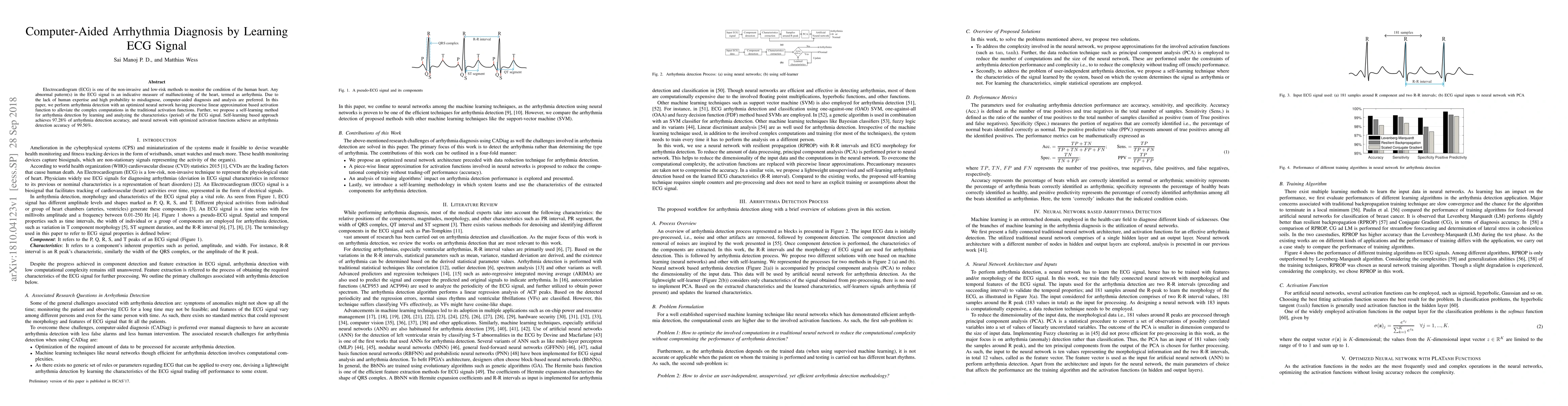 This paper presents a computer-aided system for diagnosing arrhythmia using ECG signals, employing an optimized neural network with a piecewise linear activation function for efficient computation. The self-learning method achieves 97.28% accuracy, while the optimized neural network reaches 99.56% accuracy in arrhythmia detection.