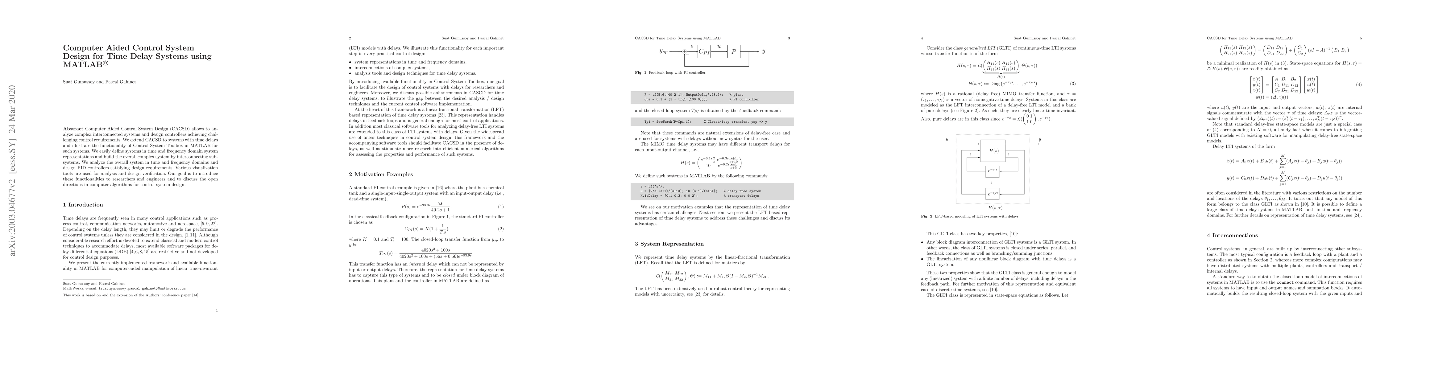 This paper explores the application of MATLAB's Control System Toolbox for designing controllers for time delay systems using Computer Aided Control System Design (CACSD). The authors demonstrate how to define, analyze, and interconnect subsystems, and design PID controllers to meet specific requirements, utilizing MATLAB's visualization tools for verification.