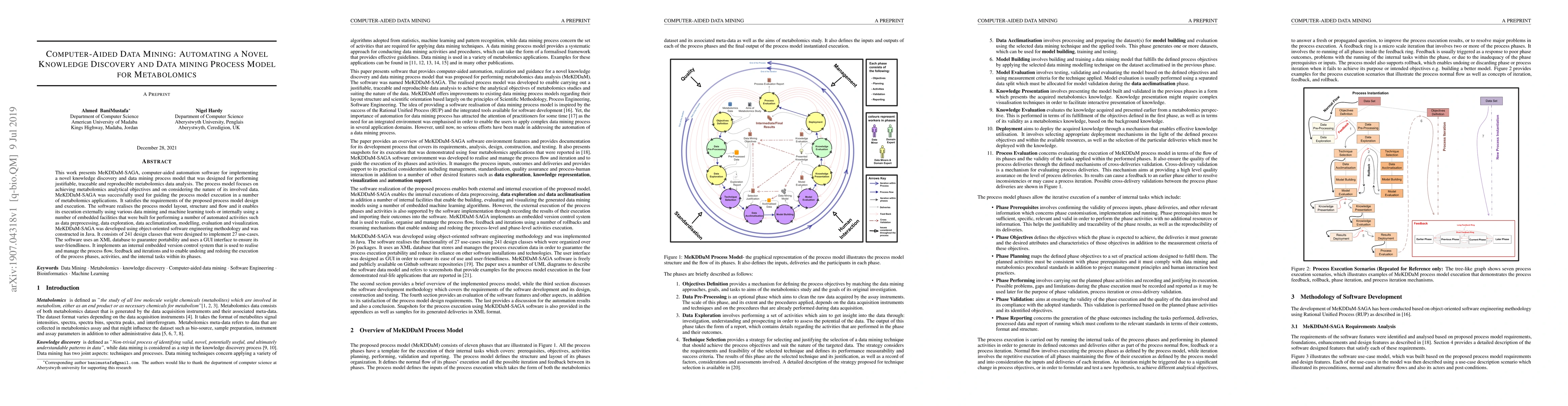 This work presents MeKDDaM-SAGA, computer-aided automation software for implementing a novel knowledge discovery and data mining process model that was designed for performing justifiable, traceable and reproducible metabolomics data analysis. The process model focuses on achieving metabolomics analytical objectives and on considering the nature of its involved data. MeKDDaM-SAGA was successfully used for guiding the process model execution in a number of metabolomics applications. It satisfies the requirements of the proposed process model design and execution. The software realises the process model layout, structure and flow and it enables its execution externally using various data mining and machine learning tools or internally using a number of embedded facilities that were built for performing a number of automated activities such as data preprocessing, data exploration, data acclimatization, modelling, evaluation and visualization. MeKDDaM-SAGA was developed using object-oriented software engineering methodology and was constructed in Java. It consists of 241 design classes that were designed to implement 27 use-cases. The software uses an XML database to guarantee portability and uses a GUI interface to ensure its user-friendliness. It implements an internal embedded version control system that is used to realise and manage the process flow, feedback and iterations and to enable undoing and redoing the execution of the process phases, activities, and the internal tasks within its phases.
