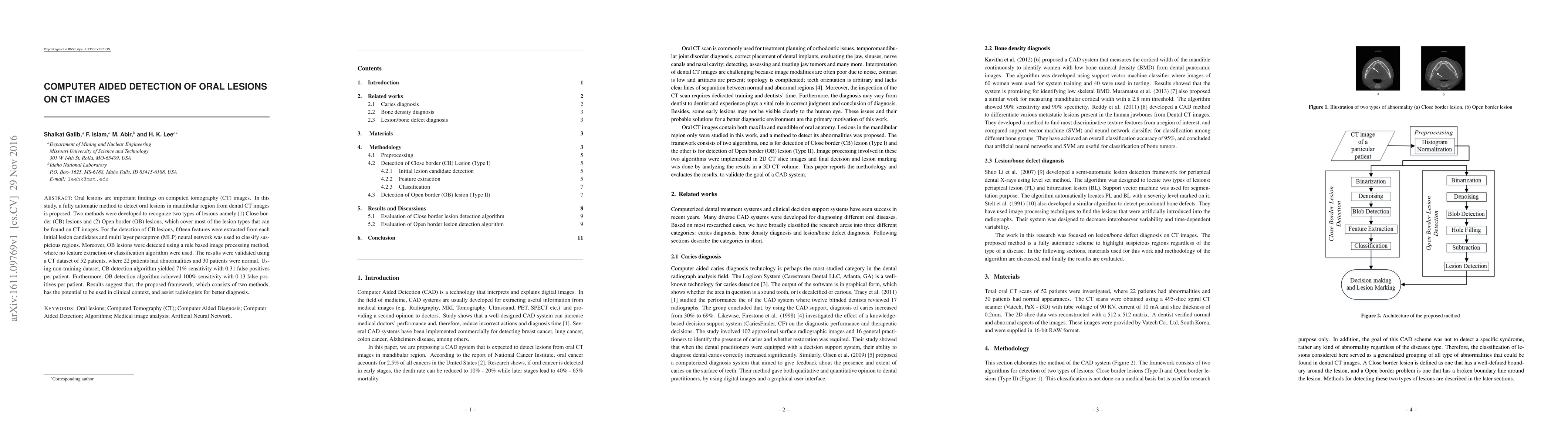 A fully automatic method was proposed to detect oral lesions in the mandibular region from dental CT images, using two methods for recognizing Close Border (CB) and Open Border (OB) lesions. CB lesion detection employed a Multi-Layer Perceptron (MLP) neural network with 15 features, while OB lesion detection used a rule-based image processing method.
