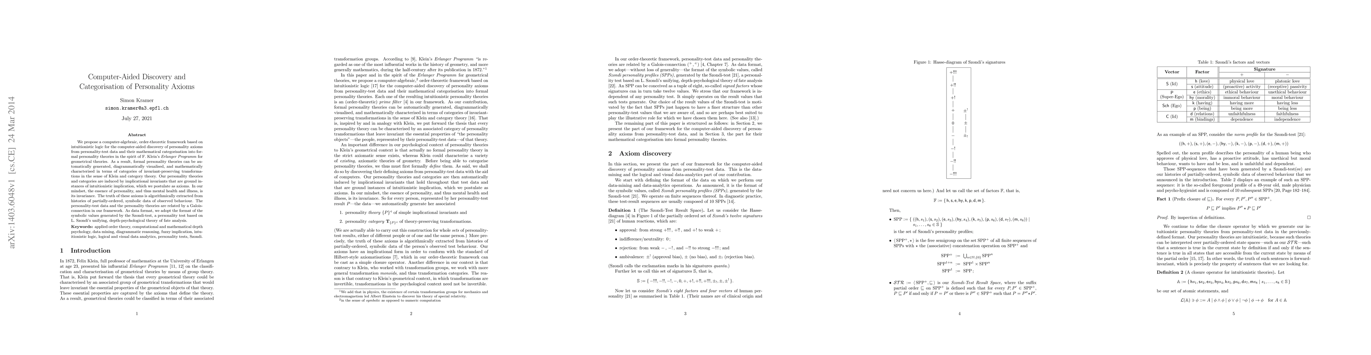We propose a computer-algebraic, order-theoretic framework based on intuitionistic logic for the computer-aided discovery of personality axioms from personality-test data and their mathematical categorisation into formal personality theories in the spirit of F.~Klein's Erlanger Programm for geometrical theories. As a result, formal personality theories can be automatically generated, diagrammatically visualised, and mathematically characterised in terms of categories of invariant-preserving transformations in the sense of Klein and category theory. Our personality theories and categories are induced by implicational invariants that are ground instances of intuitionistic implication, which we postulate as axioms. In our mindset, the essence of personality, and thus mental health and illness, is its invariance. The truth of these axioms is algorithmically extracted from histories of partially-ordered, symbolic data of observed behaviour. The personality-test data and the personality theories are related by a Galois-connection in our framework. As data format, we adopt the format of the symbolic values generated by the Szondi-test, a personality test based on L.~Szondi's unifying, depth-psychological theory of fate analysis.