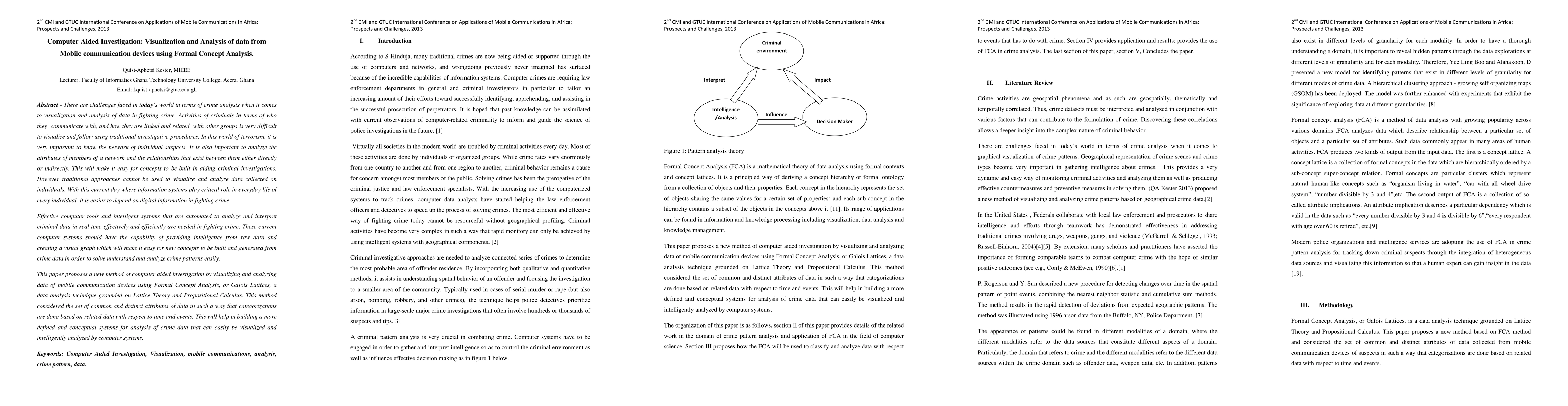 This paper proposes a new method for analyzing mobile communication data using Formal Concept Analysis to help solve crime patterns and understand networks of suspects. It aims to provide a visual graph and intelligent analysis capabilities for law enforcement.