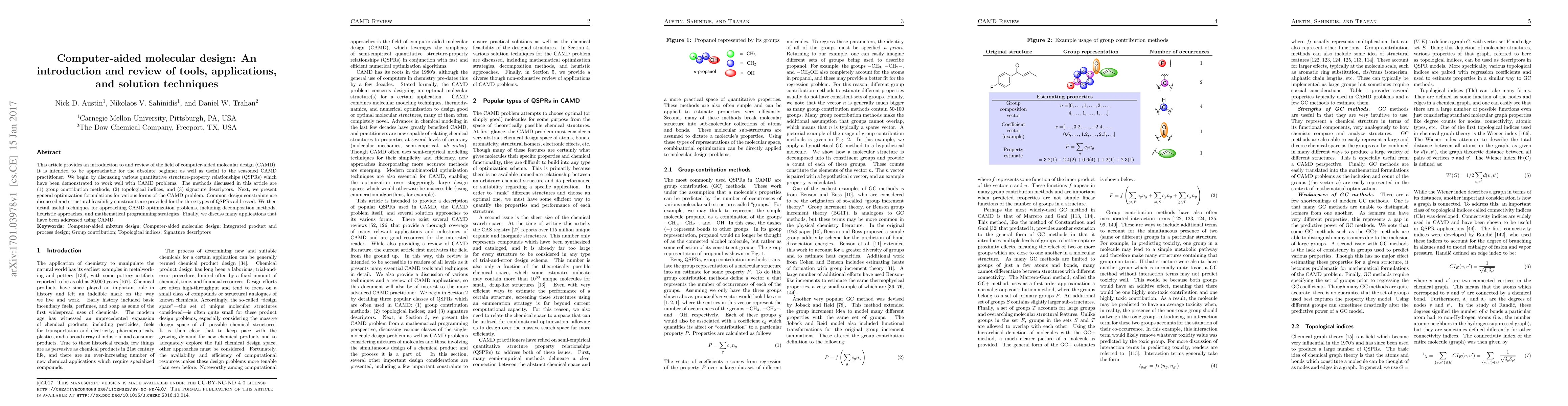 This article provides an introduction to and review of the field of computer-aided molecular design (CAMD). It is intended to be approachable for the absolute beginner as well as useful to the seasoned CAMD practitioner. We begin by discussing various quantitative structure-property relationships (QSPRs) which have been demonstrated to work well with CAMD problems. The methods discussed in this article are (1) group contribution methods, (2) topological indices, and (3) signature descriptors. Next, we present general optimization formulations for various forms of the CAMD problem. Common design constraints are discussed and structural feasibility constraints are provided for the three types of QSPRs addressed. We then detail useful techniques for approaching CAMD optimization problems, including decomposition methods, heuristic approaches, and mathematical programming strategies. Finally, we discuss many applications that have been addressed using CAMD.