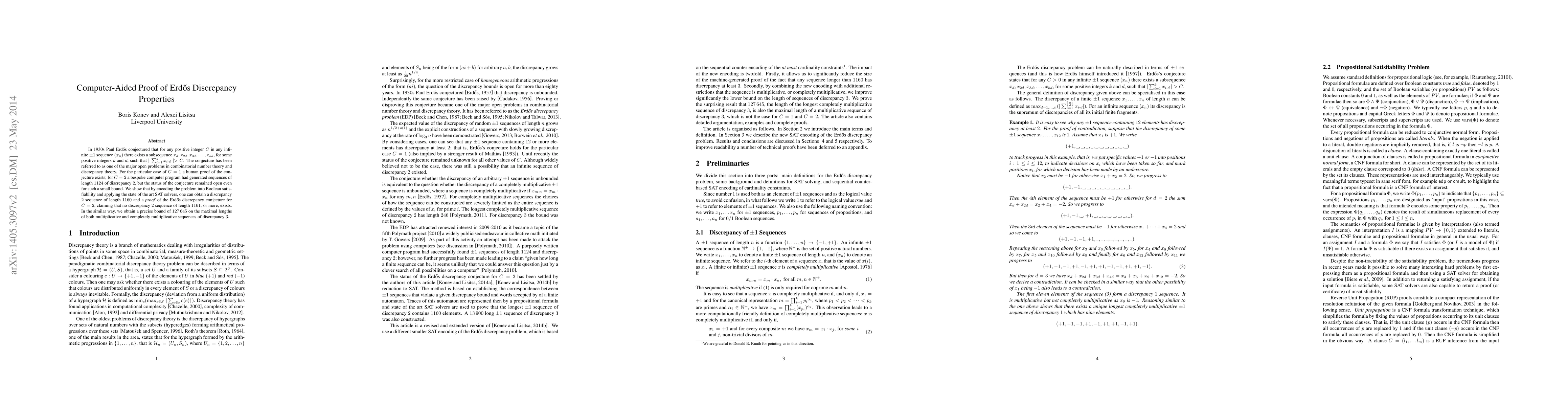 In 1930s Paul Erdos conjectured that for any positive integer $C$ in any infinite $\pm 1$ sequence $(x_n)$ there exists a subsequence $x_d, x_{2d}, x_{3d},\dots, x_{kd}$, for some positive integers $k$ and $d$, such that $\mid \sum_{i=1}^k x_{i\cdot d} \mid >C$. The conjecture has been referred to as one of the major open problems in combinatorial number theory and discrepancy theory. For the particular case of $C=1$ a human proof of the conjecture exists; for $C=2$ a bespoke computer program had generated sequences of length $1124$ of discrepancy $2$, but the status of the conjecture remained open even for such a small bound. We show that by encoding the problem into Boolean satisfiability and applying the state of the art SAT solvers, one can obtain a discrepancy $2$ sequence of length $1160$ and a proof of the Erd\H{o}s discrepancy conjecture for $C=2$, claiming that no discrepancy 2 sequence of length $1161$, or more, exists. In the similar way, we obtain a precise bound of $127\,645$ on the maximal lengths of both multiplicative and completely multiplicative sequences of discrepancy $3$. We also demonstrate that unrestricted discrepancy 3 sequences can be longer than $130\,000$.