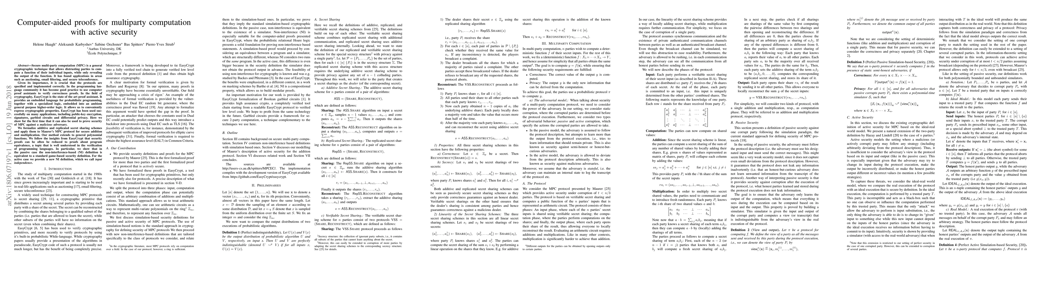 Secure multi-party computation (MPC) is a general cryptographic technique that allows distrusting parties to compute a function of their individual inputs, while only revealing the output of the function. It has found applications in areas such as auctioning, email filtering, and secure teleconference. Given its importance, it is crucial that the protocols are specified and implemented correctly. In the programming language community it has become good practice to use computer proof assistants to verify correctness proofs. In the field of cryptography, EasyCrypt is the state of the art proof assistant. It provides an embedded language for probabilistic programming, together with a specialized logic, embedded into an ambient general purpose higher-order logic. It allows us to conveniently express cryptographic properties. EasyCrypt has been used successfully on many applications, including public-key encryption, signatures, garbled circuits and differential privacy. Here we show for the first time that it can also be used to prove security of MPC against a malicious adversary. We formalize additive and replicated secret sharing schemes and apply them to Maurer's MPC protocol for secure addition and multiplication. Our method extends to general polynomial functions. We follow the insights from EasyCrypt that security proofs can be often be reduced to proofs about program equivalence, a topic that is well understood in the verification of programming languages. In particular, we show that in the passive case the non-interference-based definition is equivalent to a standard game-based security definition. For the active case we provide a new NI definition, which we call input independence.