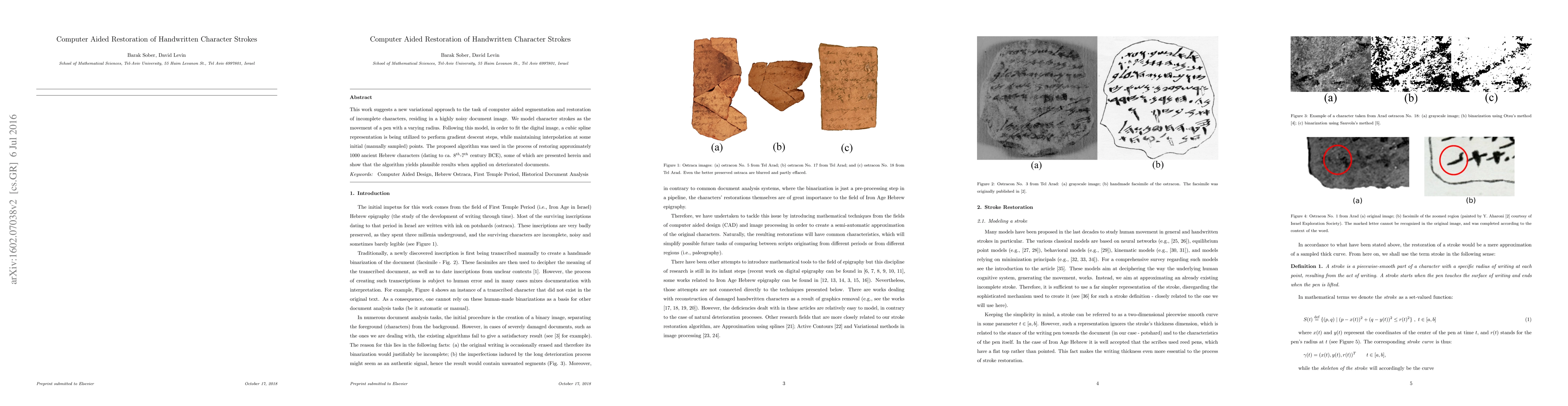 This paper proposes a variational approach for restoring incomplete handwritten characters in noisy documents, using a cubic spline model of pen strokes and gradient descent. The method was successfully applied to restore approximately 1000 ancient Hebrew characters from the 8th-7th century BCE, demonstrating its effectiveness.