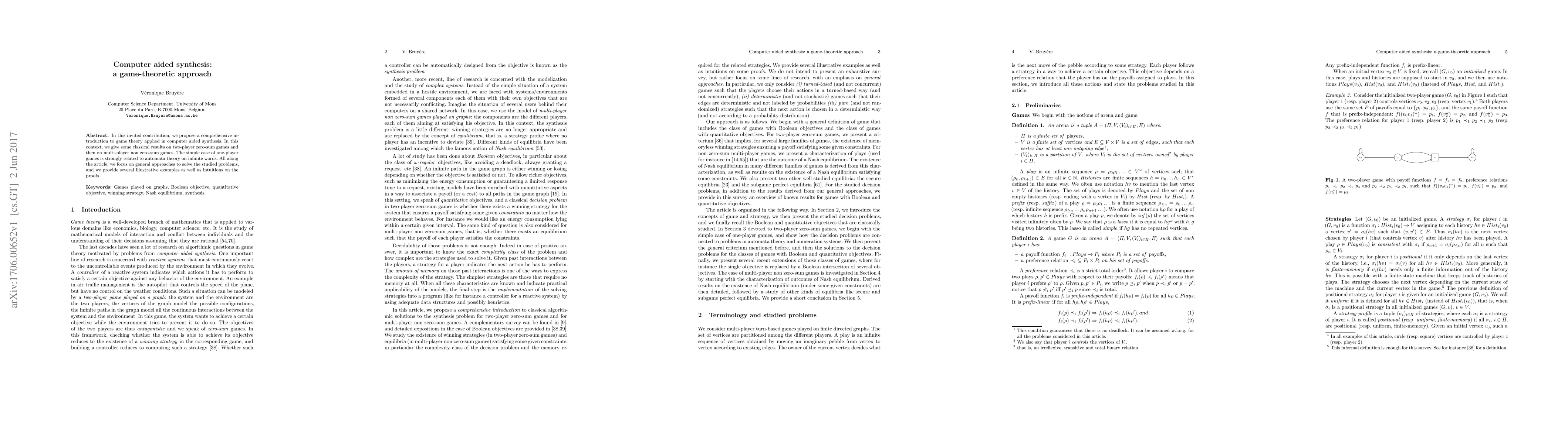 In this invited contribution, we propose a comprehensive introduction to game theory applied in computer aided synthesis. In this context, we give some classical results on two-player zero-sum games and then on multi-player non zero-sum games. The simple case of one-player games is strongly related to automata theory on infinite words. All along the article, we focus on general approaches to solve the studied problems, and we provide several illustrative examples as well as intuitions on the proofs.