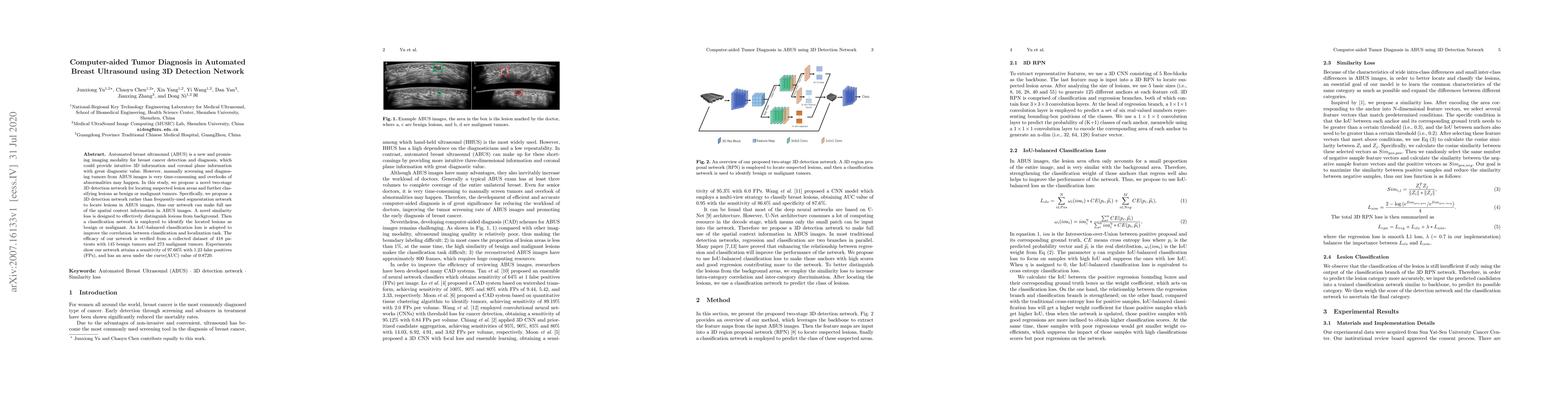 This paper proposes a novel two-stage 3D detection network for automated breast ultrasound (ABUS) to locate and classify tumors as benign or malignant, achieving 97.66% sensitivity and an AUC of 0.8720, significantly reducing the time and errors in manual diagnosis.