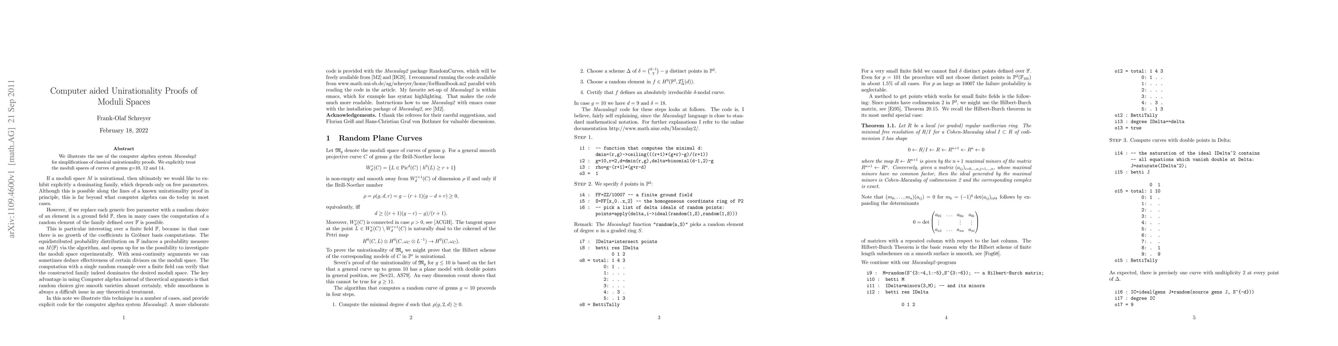 This paper demonstrates the application of Macaulay2 for simplifying classical unirationality proofs, focusing on moduli spaces of curves with genus g=10, 12, and 14. The study showcases computational techniques to support these proofs.