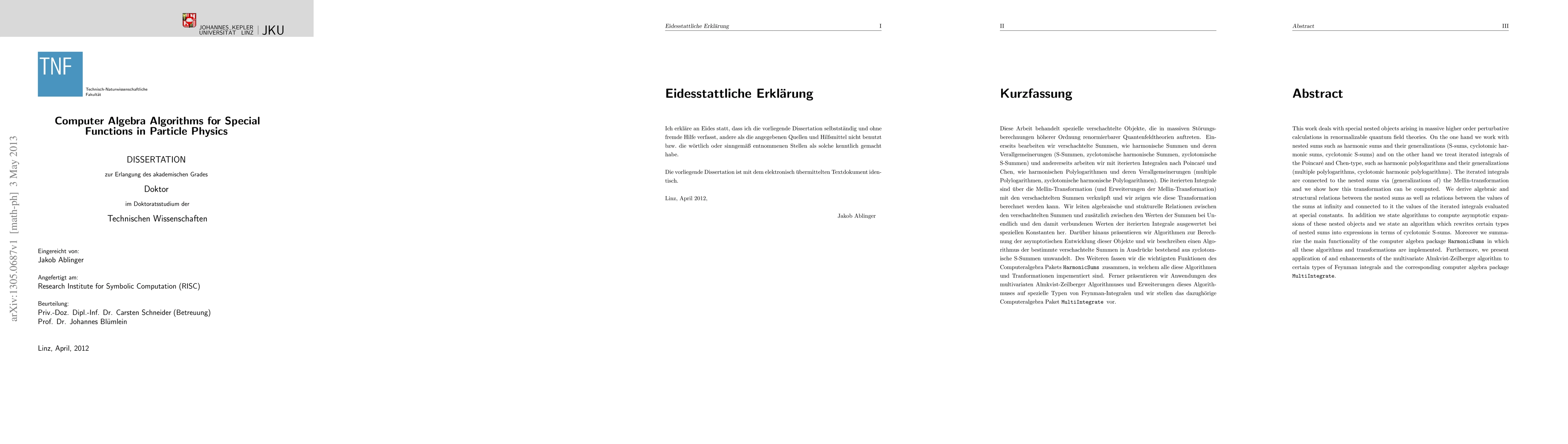 This paper develops algorithms for computing special nested objects in quantum field theory, including nested sums and iterated integrals, and introduces computer algebra tools for their evaluation. It also extends the Almkvist-Zeilberger algorithm for Feynman integrals and summarizes the functionalities of the HarmonicSums and MultiIntegrate packages.