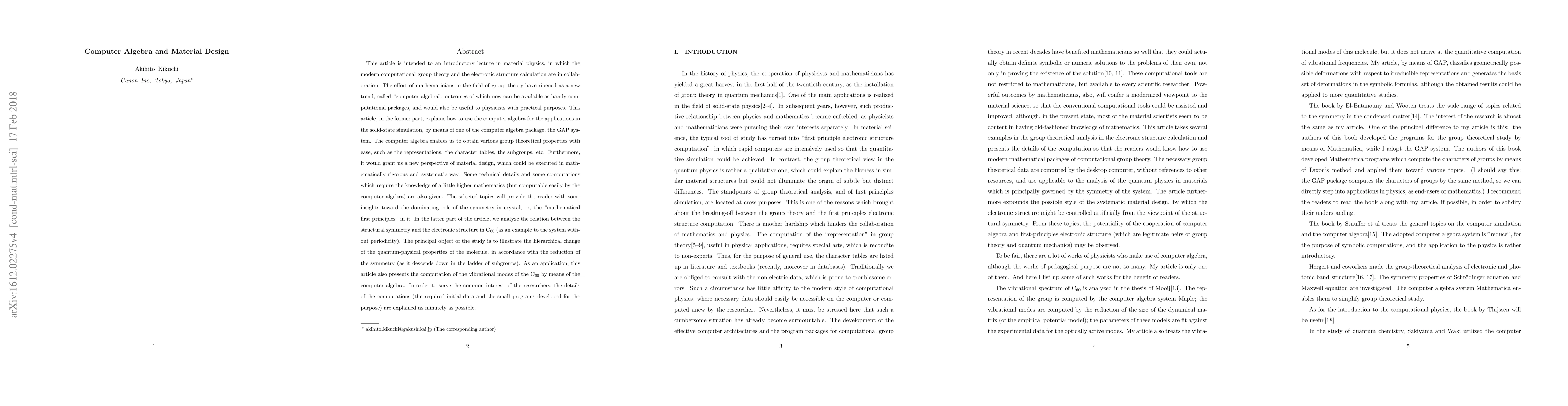 This article is intended to an introductory lecture in material physics, in which the modern computational group theory and the electronic structure calculation are in collaboration. The effort of mathematicians in field of the group theory, have ripened as a new trend, called "computer algebra", outcomes of which now can be available as handy computational packages, and would also be useful to physicists with practical purposes. This article, in the former part, explains how to use the computer algebra for the applications in the solid-state simulation, by means of one of the computer algebra package, the GAP system. The computer algebra enables us to obtain various group theoretical properties with ease, such as the representations, the character tables, the subgroups, etc. Furthermore it would grant us a new perspective of material design, which could be executed in mathematically rigorous and systematic way. Some technical details and some computations which require the knowledge of a little higher mathematics (but computable easily by the computer algebra) are also given. The selected topics will provide the reader with some insights toward the dominating role of the symmetry in crystal, or, the "mathematical first principles" in it. In the latter part of the article, we analyze the relation between the structural symmetry and the electronic structure in C$_{60}$ (as an example to the sysmem without periodicity). The principal object of the study is to illustrate the hierarchical change of the quantum-physical properties of the molecule, in accordance with the reduction of the symmetry (as it descends down in the ladder of subgroups). In order to serve the common interest of the researchers, the details of the computations (the required initial data and the small programs developed for the purpose) are explained as minutely as possible.