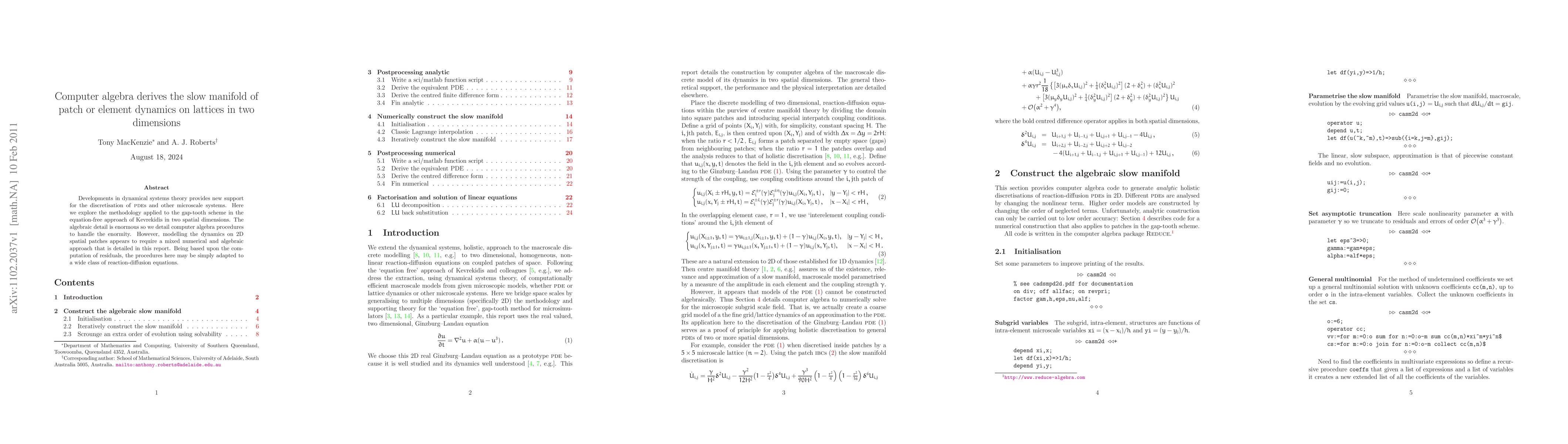 This paper develops a methodology for deriving the slow manifold of patch or element dynamics on lattices in two dimensions using the equation-free approach. It employs computer algebra to manage the extensive algebraic details, focusing on the gap-tooth scheme and its application to reaction-diffusion equations.