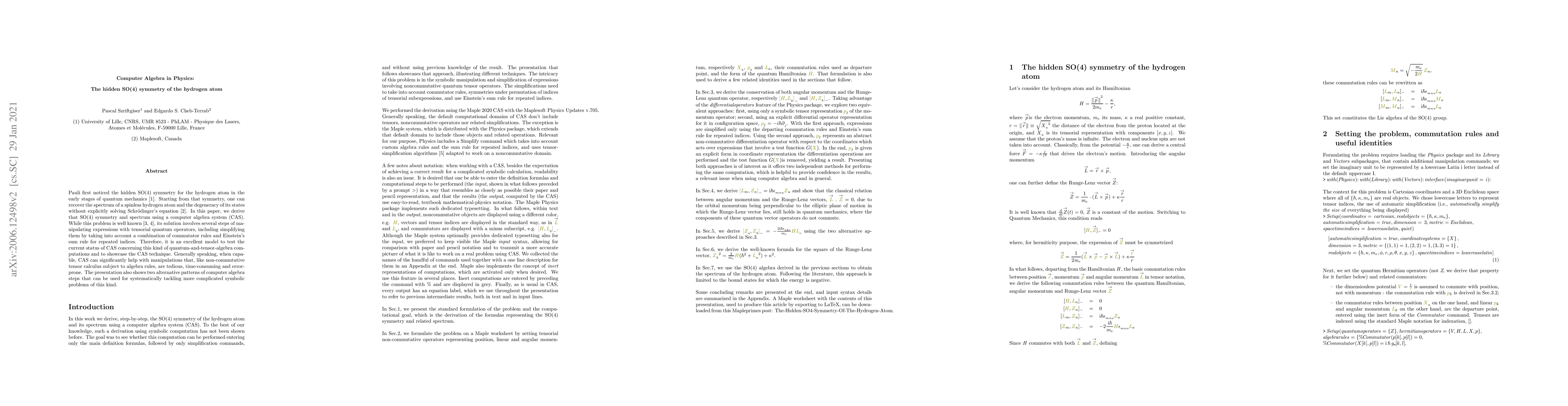 This paper explores the hidden SO(4) symmetry of the hydrogen atom using computer algebra systems (CAS) to derive the symmetry and spectrum without solving Schrödinger's equation. It demonstrates the utility of CAS in handling complex tensorial quantum operator manipulations, showcasing a pattern useful for tackling more intricate symbolic problems.