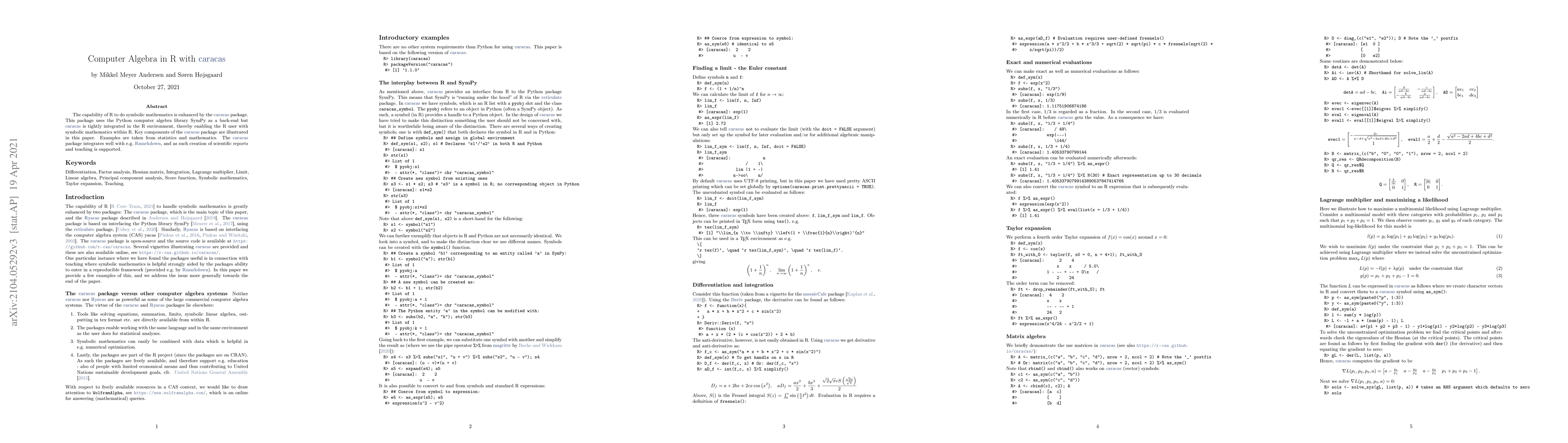 The capability of R to do symbolic mathematics is enhanced by the caracas package. This package uses the Python computer algebra library SymPy as a back-end but caracas is tightly integrated in the R environment, thereby enabling the R user with symbolic mathematics within R. Key components of the caracas package are illustrated in this paper. Examples are taken from statistics and mathematics. The caracas package integrates well with e.g. Rmarkdown, and as such creation of scientific reports and teaching is supported.