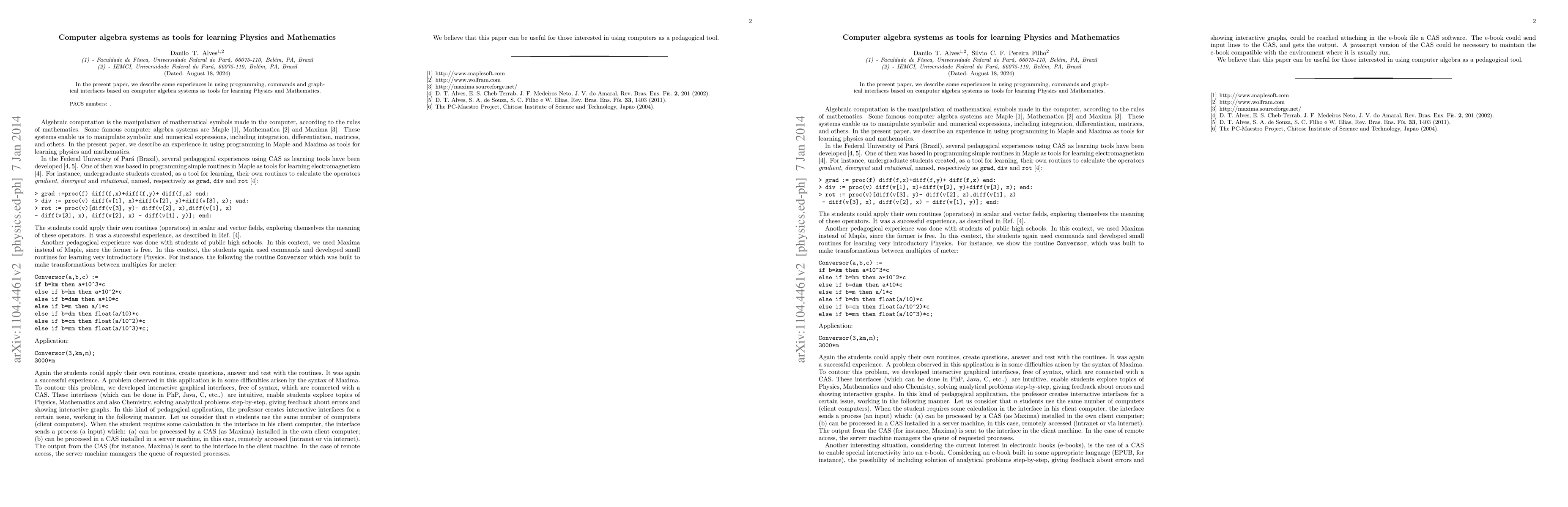 Summary: This paper explores the use of computer algebra systems to enhance the learning of Physics and Mathematics through programming, commands, and graphical interfaces, highlighting their effectiveness as educational tools.
