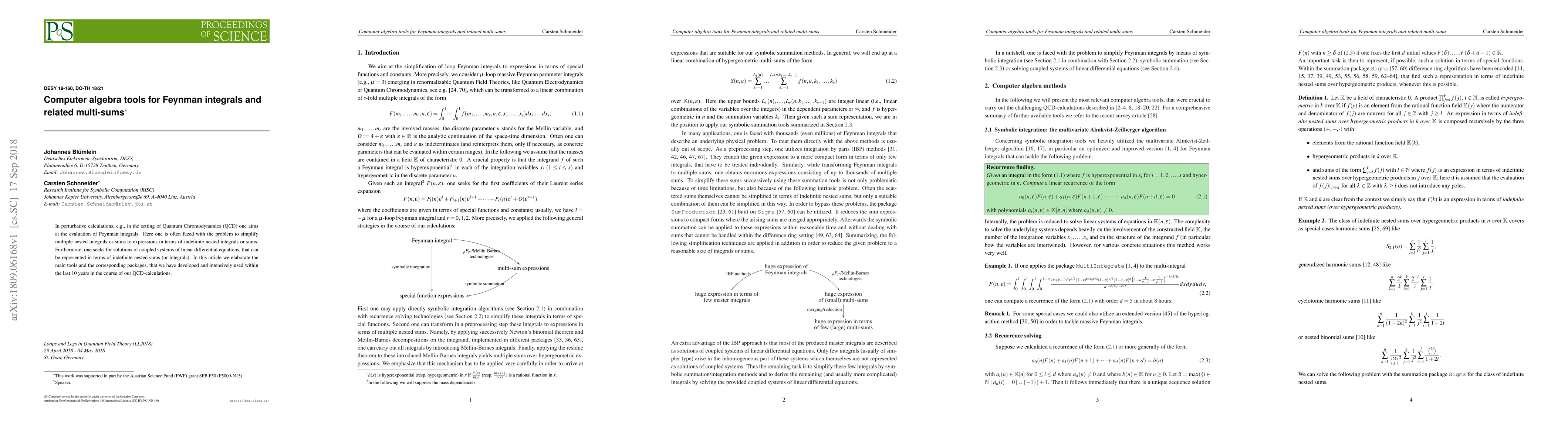 This paper discusses computer algebra tools for simplifying complex integrals and sums in physics calculations, particularly those related to Quantum Chromodynamics.