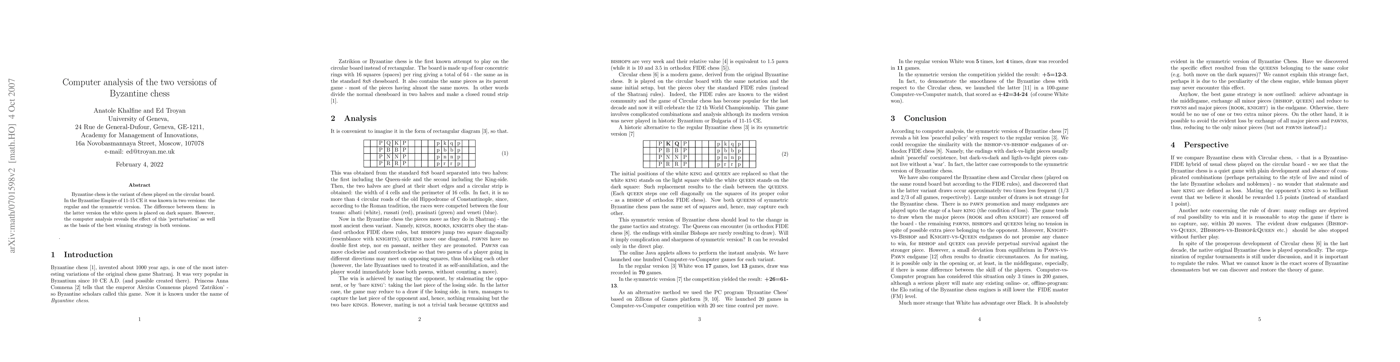 In the Byzantine Empire of 11-15 CE chess was played on the circular board. Two versions were known - REGULAR and SYMMETRIC. The difference between them is easy: the white queen is placed either on light (regular) or on dark square (symmetric). However, the computer analysis reveals the results of this 'small perturbation'.