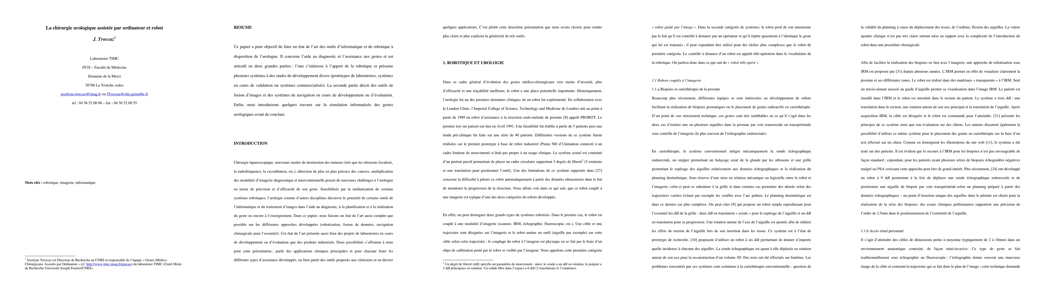The author reviews the computer and robotic tools available to urologists to help in diagnosis and technical procedures. The first part concerns the contribution of robotics and presents several systems at various stages of development (laboratory prototypes, systems under validation or marketed systems). The second part describes image fusion tools and navigation systems currently under development or evaluation. Several studies on computerized simulation of urological procedures are also presented.