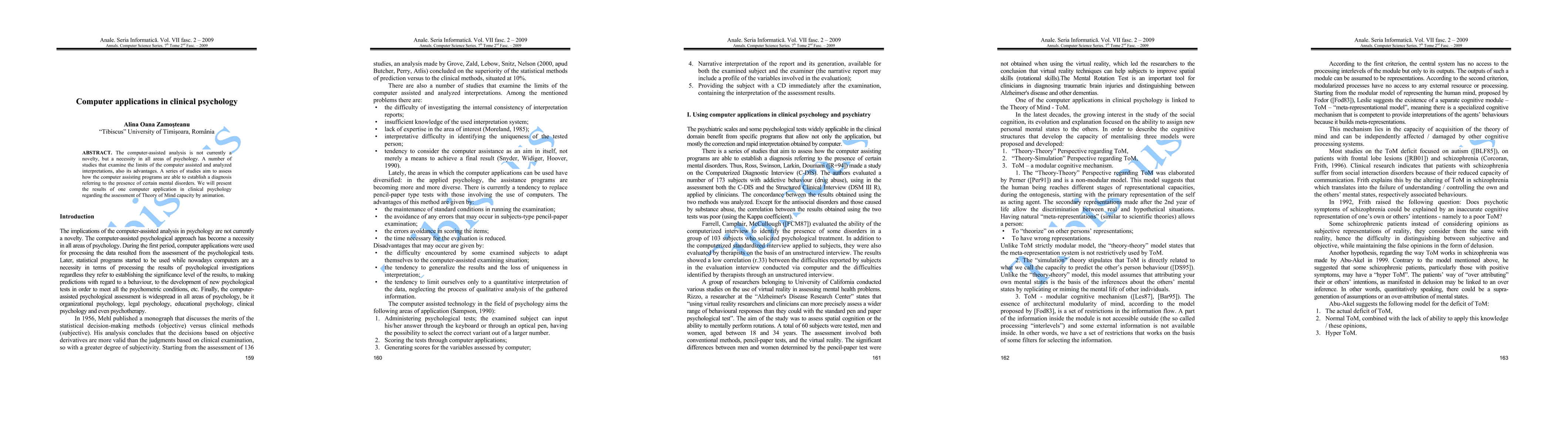 The computer-assisted analysis is not currently a novelty, but a necessity in all areas of psychology. A number of studies that examine the limits of the computer assisted and analyzed interpretations, also its advantages. A series of studies aim to assess how the computer assisting programs are able to establish a diagnosis referring to the presence of certain mental disorders. We will present the results of one computer application in clinical psychology regarding the assessment of Theory of Mind capacity by animation.