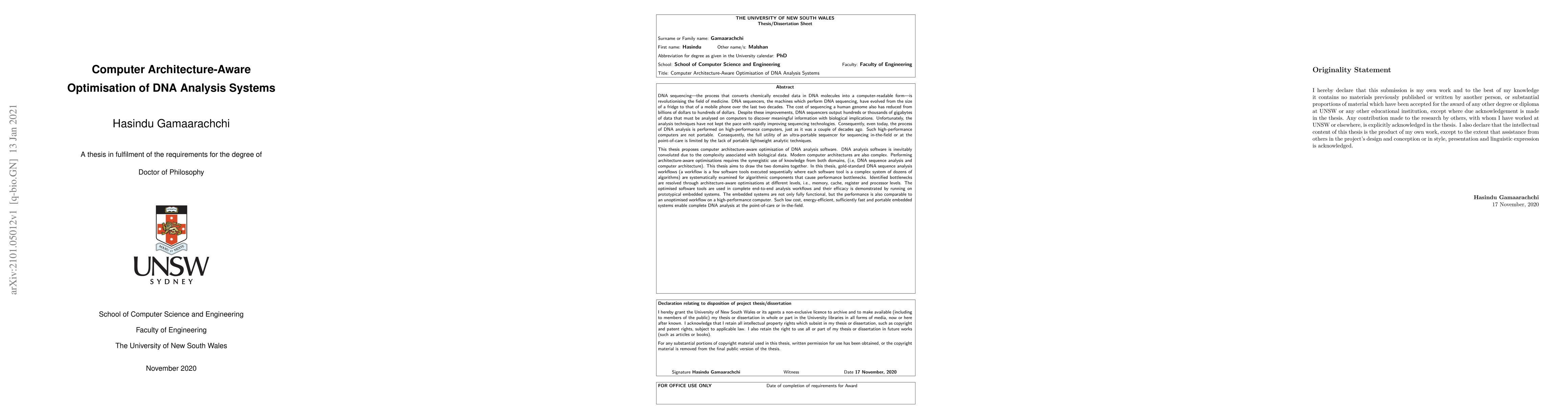 DNA sequencing is revolutionising the field of medicine. DNA sequencers, the machines which perform DNA sequencing, have evolved from the size of a fridge to that of a mobile phone over the last two decades. The cost of sequencing a human genome also has reduced from billions of dollars to hundreds of dollars. Despite these improvements, DNA sequencers output hundreds or thousands of gigabytes of data that must be analysed on computers to discover meaningful information with biological implications. Unfortunately, the analysis techniques have not kept the pace with rapidly improving sequencing technologies. Consequently, even today, the process of DNA analysis is performed on high-performance computers, just as it was a couple of decades ago. Such high-performance computers are not portable. Consequently, the full utility of an ultra-portable sequencer for sequencing in-the-field or at the point-of-care is limited by the lack of portable lightweight analytic techniques. This thesis proposes computer architecture-aware optimisation of DNA analysis software. DNA analysis software is inevitably convoluted due to the complexity associated with biological data. Modern computer architectures are also complex. Performing architecture-aware optimisations requires the synergistic use of knowledge from both domains, (i.e, DNA sequence analysis and computer architecture). This thesis aims to draw the two domains together. In this thesis, gold-standard DNA sequence analysis workflows are systematically examined for algorithmic components that cause performance bottlenecks. Identified bottlenecks are resolved through architecture-aware optimisations at different levels, i.e., memory, cache, register and processor. The optimised software tools are used in complete end-to-end analysis workflows and their efficacy is demonstrated by running on prototypical embedded systems.