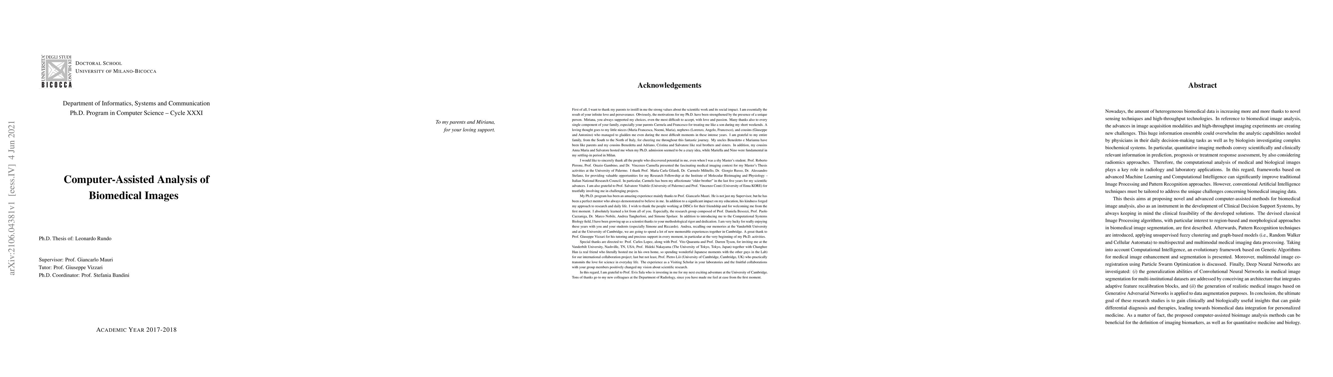 Nowadays, the amount of heterogeneous biomedical data is increasing more and more thanks to novel sensing techniques and high-throughput technologies. In reference to biomedical image analysis, the advances in image acquisition modalities and high-throughput imaging experiments are creating new challenges. This huge information ensemble could overwhelm the analytic capabilities needed by physicians in their daily decision-making tasks as well as by biologists investigating complex biochemical systems. In particular, quantitative imaging methods convey scientifically and clinically relevant information in prediction, prognosis or treatment response assessment, by also considering radiomics approaches. Therefore, the computational analysis of medical and biological images plays a key role in radiology and laboratory applications. In this regard, frameworks based on advanced Machine Learning and Computational Intelligence can significantly improve traditional Image Processing and Pattern Recognition approaches. However, conventional Artificial Intelligence techniques must be tailored to address the unique challenges concerning biomedical imaging data. This thesis aims at proposing novel and advanced computer-assisted methods for biomedical image analysis, also as an instrument in the development of Clinical Decision Support Systems, by always keeping in mind the clinical feasibility of the developed solutions. In conclusion, the ultimate goal of these research studies is to gain clinically and biologically useful insights that can guide differential diagnosis and therapies, leading towards biomedical data integration for personalized medicine. As a matter of fact, the proposed computer-assisted bioimage analysis methods can be beneficial for the definition of imaging biomarkers, as well as for quantitative medicine and biology.