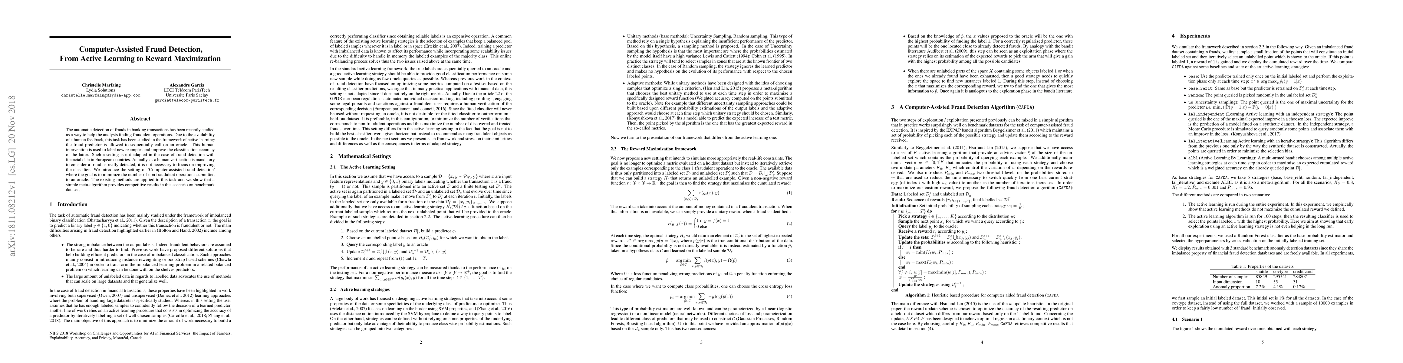 The automatic detection of frauds in banking transactions has been recently studied as a way to help the analysts finding fraudulent operations. Due to the availability of a human feedback, this task has been studied in the framework of active learning: the fraud predictor is allowed to sequentially call on an oracle. This human intervention is used to label new examples and improve the classification accuracy of the latter. Such a setting is not adapted in the case of fraud detection with financial data in European countries. Actually, as a human verification is mandatory to consider a fraud as really detected, it is not necessary to focus on improving the classifier. We introduce the setting of 'Computer-assisted fraud detection' where the goal is to minimize the number of non fraudulent operations submitted to an oracle. The existing methods are applied to this task and we show that a simple meta-algorithm provides competitive results in this scenario on benchmark datasets.