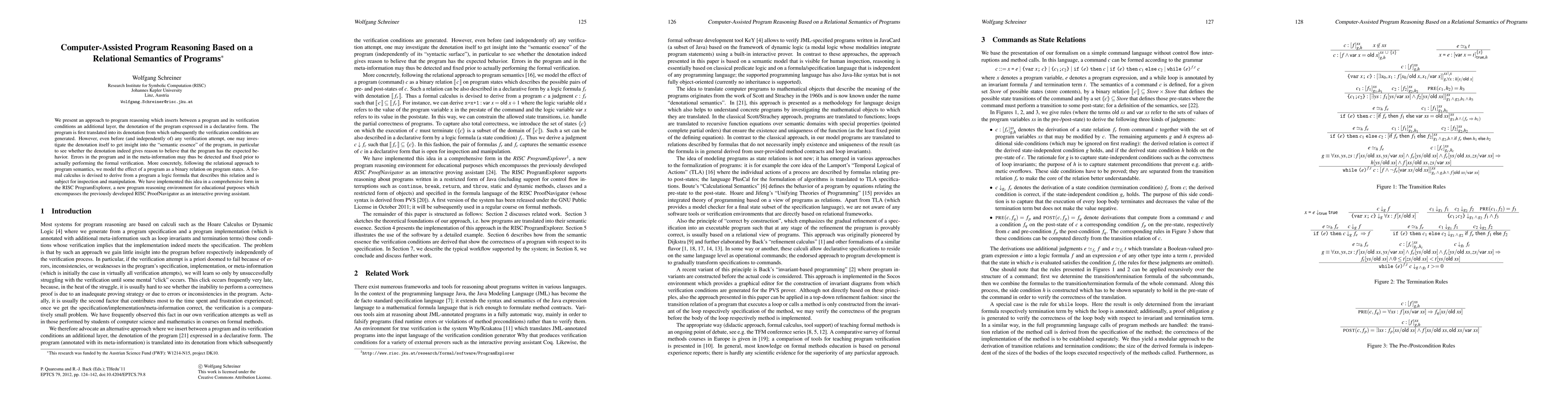 We present an approach to program reasoning which inserts between a program and its verification conditions an additional layer, the denotation of the program expressed in a declarative form. The program is first translated into its denotation from which subsequently the verification conditions are generated. However, even before (and independently of) any verification attempt, one may investigate the denotation itself to get insight into the "semantic essence" of the program, in particular to see whether the denotation indeed gives reason to believe that the program has the expected behavior. Errors in the program and in the meta-information may thus be detected and fixed prior to actually performing the formal verification. More concretely, following the relational approach to program semantics, we model the effect of a program as a binary relation on program states. A formal calculus is devised to derive from a program a logic formula that describes this relation and is subject for inspection and manipulation. We have implemented this idea in a comprehensive form in the RISC ProgramExplorer, a new program reasoning environment for educational purposes which encompasses the previously developed RISC ProofNavigator as an interactive proving assistant.
