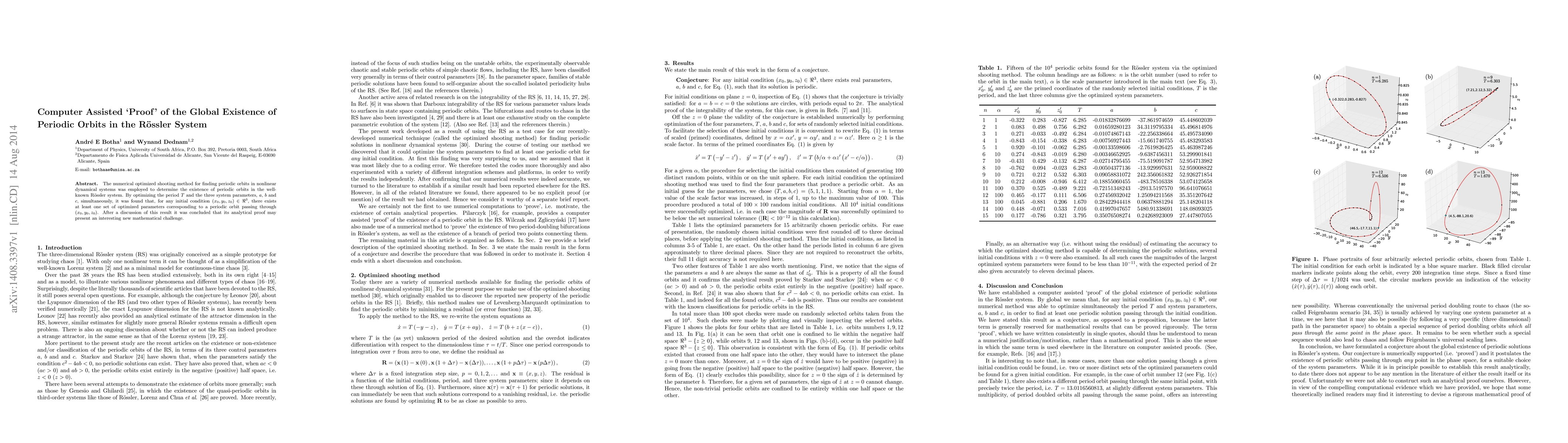 The numerical optimized shooting method for finding periodic orbits in nonlinear dynamical systems was employed to determine the existence of periodic orbits in the well-known R\"ossler system. By optimizing the period $T$ and the three system parameters, $a$, $b$ and $c$, simultaneously, it was found that, for any initial condition $(x_0,y_0,z_0) \in \Re^3$, there exists at least one set of optimized parameters corresponding to a periodic orbit passing through $ (x_0,y_0,z_0)$. After a discussion of this result it was concluded that its analytical proof may present an interesting new mathematical challenge.