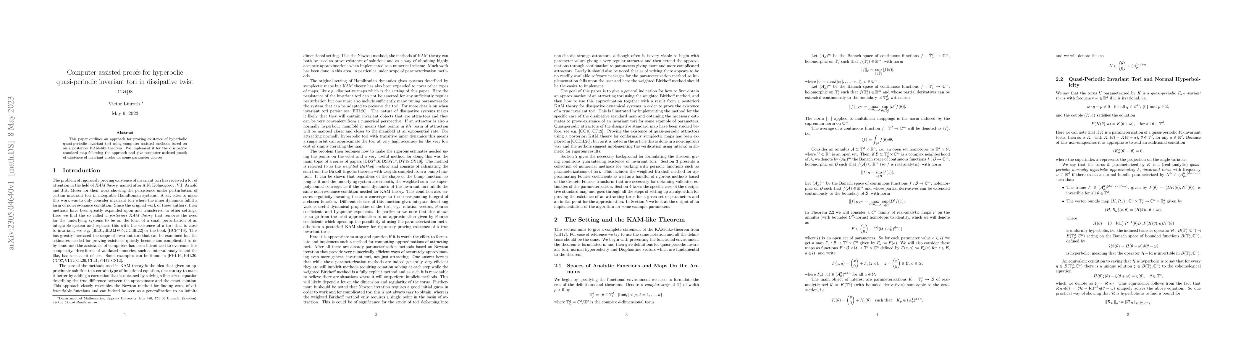 This paper outlines an approach for proving existence of hyperbolic quasi-periodic invariant tori using computer assisted methods based on an a posteriori KAM-like theorem. We implement it for the dissipative standard map following the approach and give computer assisted proofs of existence of invariant circles for some parameter choices.