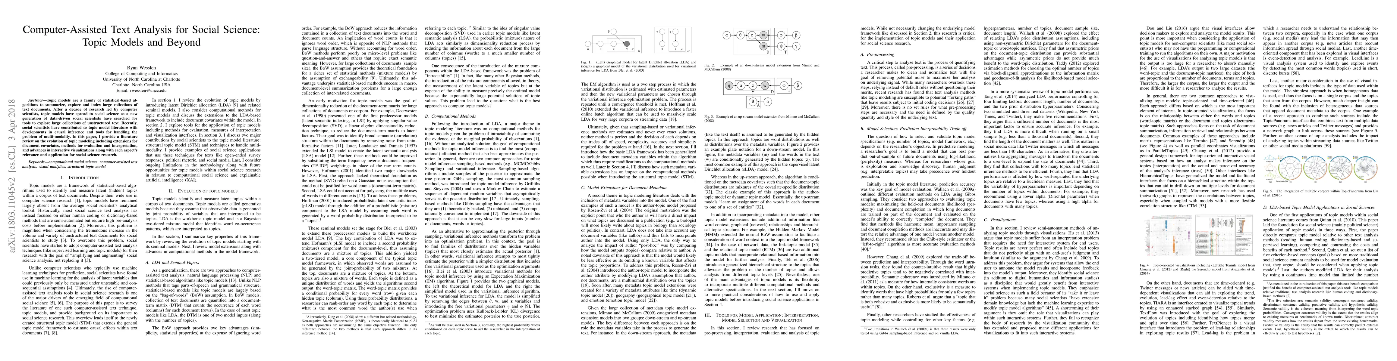 Topic models are a family of statistical-based algorithms to summarize, explore and index large collections of text documents. After a decade of research led by computer scientists, topic models have spread to social science as a new generation of data-driven social scientists have searched for tools to explore large collections of unstructured text. Recently, social scientists have contributed to topic model literature with developments in causal inference and tools for handling the problem of multi-modality. In this paper, I provide a literature review on the evolution of topic modeling including extensions for document covariates, methods for evaluation and interpretation, and advances in interactive visualizations along with each aspect's relevance and application for social science research.