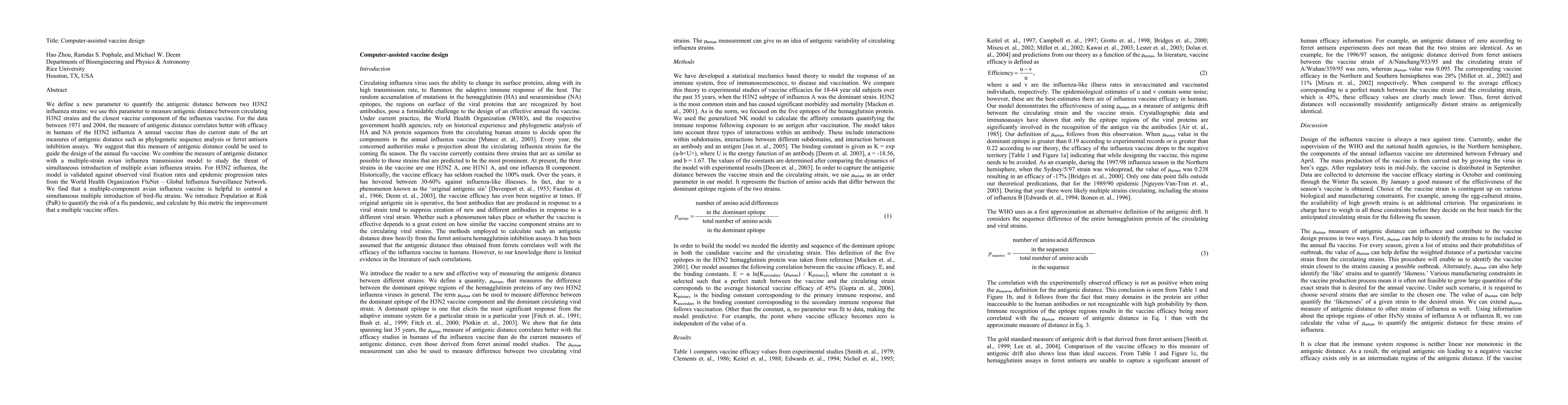 We define a new parameter to quantify the antigenic distance between two H3N2 influenza strains: we use this parameter to measure antigenic distance between circulating H3N2 strains and the closest vaccine component of the influenza vaccine. For the data between 1971 and 2004, the measure of antigenic distance correlates better with efficacy in humans of the H3N2 influenza A annual vaccine than do current state of the art measures of antigenic distance such as phylogenetic sequence analysis or ferret antisera inhibition assays. We suggest that this measure of antigenic distance could be used to guide the design of the annual flu vaccine. We combine the measure of antigenic distance with a multiple-strain avian influenza transmission model to study the threat of simultaneous introduction of multiple avian influenza strains. For H3N2 influenza, the model is validated against observed viral fixation rates and epidemic progression rates from the World Health Organization FluNet - Global Influenza Surveillance Network. We find that a multiple-component avian influenza vaccine is helpful to control a simultaneous multiple introduction of bird-flu strains. We introduce Population at Risk (PaR) to quantify the risk of a flu pandemic, and calculate by this metric the improvement that a multiple vaccine offers.