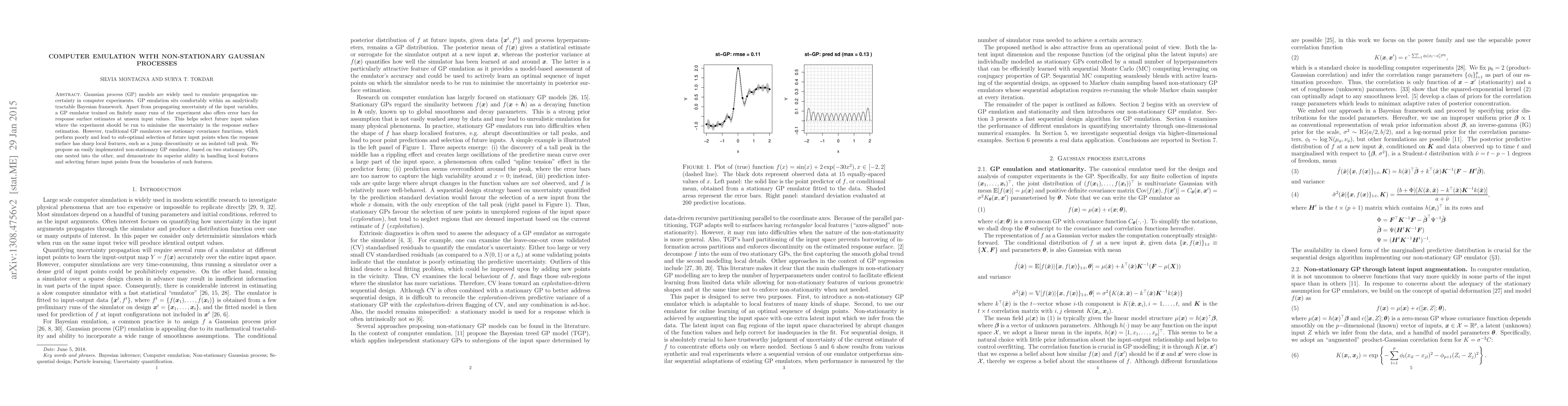 Gaussian process (GP) models are widely used to emulate propagation uncertainty in computer experiments. GP emulation sits comfortably within an analytically tractable Bayesian framework. Apart from propagating uncertainty of the input variables, a GP emulator trained on finitely many runs of the experiment also offers error bars for response surface estimates at unseen input values. This helps select future input values where the experiment should be run to minimize the uncertainty in the response surface estimation. However, traditional GP emulators use stationary covariance functions, which perform poorly and lead to sub-optimal selection of future input points when the response surface has sharp local features, such as a jump discontinuity or an isolated tall peak. We propose an easily implemented non-stationary GP emulator, based on two stationary GPs, one nested into the other, and demonstrate its superior ability in handling local features and selecting future input points from the boundaries of such features.