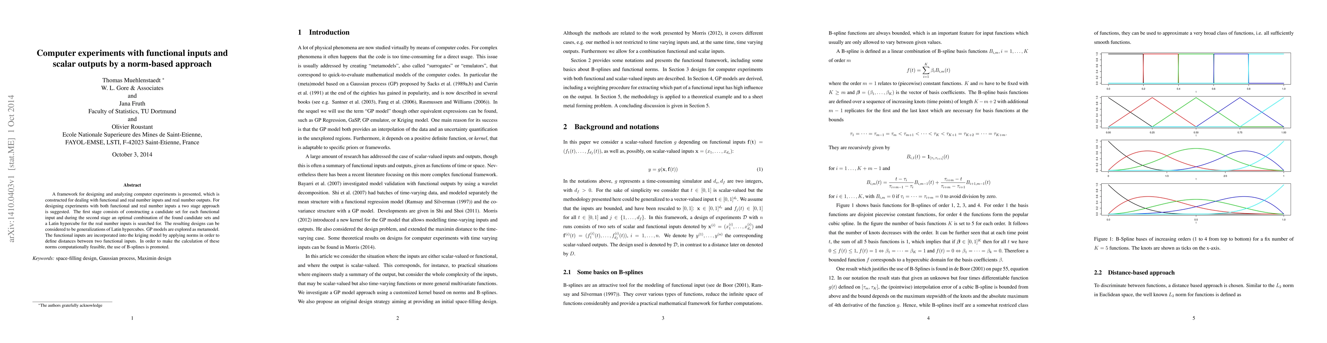 This paper proposes a framework for computer experiments with functional and real number inputs, employing a two-stage approach to design optimal experiments. It uses GP models and incorporates functional inputs via norm-based distances, with B-splines aiding computational feasibility.