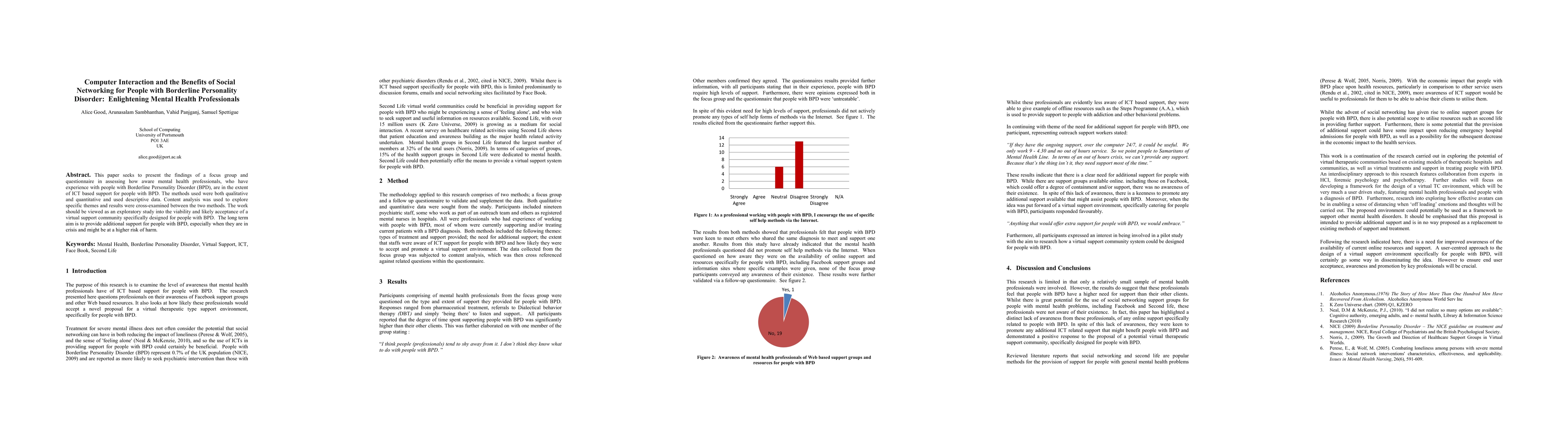 This paper seeks to present the findings of a focus group and questionnaire in assessing how aware mental health professionals, who have experience with people with Borderline Personality Disorder (BPD), are in the extent of ICT based support for people with BPD. The methods used were both qualitative and quantitative and used descriptive data. Content analysis was used to explore specific themes and results were cross-examined between the two methods. The work should be viewed as an exploratory study into the viability and likely acceptance of a virtual support community specifically designed for people with BPD. The long term aim is to provide additional support for people with BPD, especially when they are in crisis and might be at a higher risk of harm.