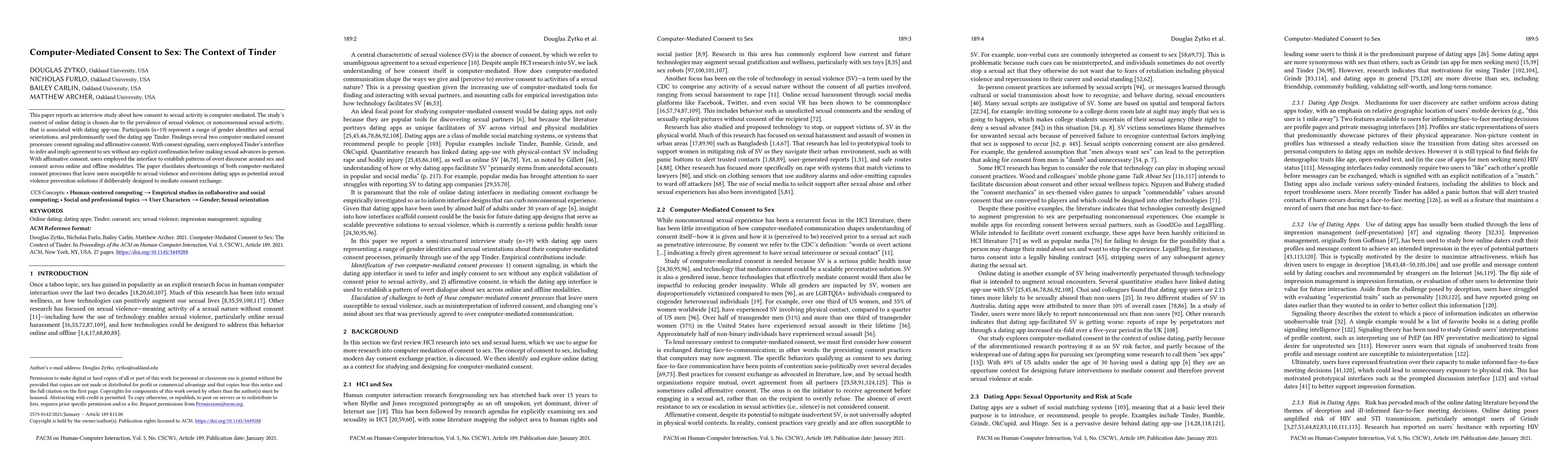A study of Tinder users found two computer-mediated consent processes: inferred agreement through interface signals and explicit discussions about sex and consent online and offline. The research highlights the need for dating apps to design consent-exchange mechanisms to prevent sexual violence.