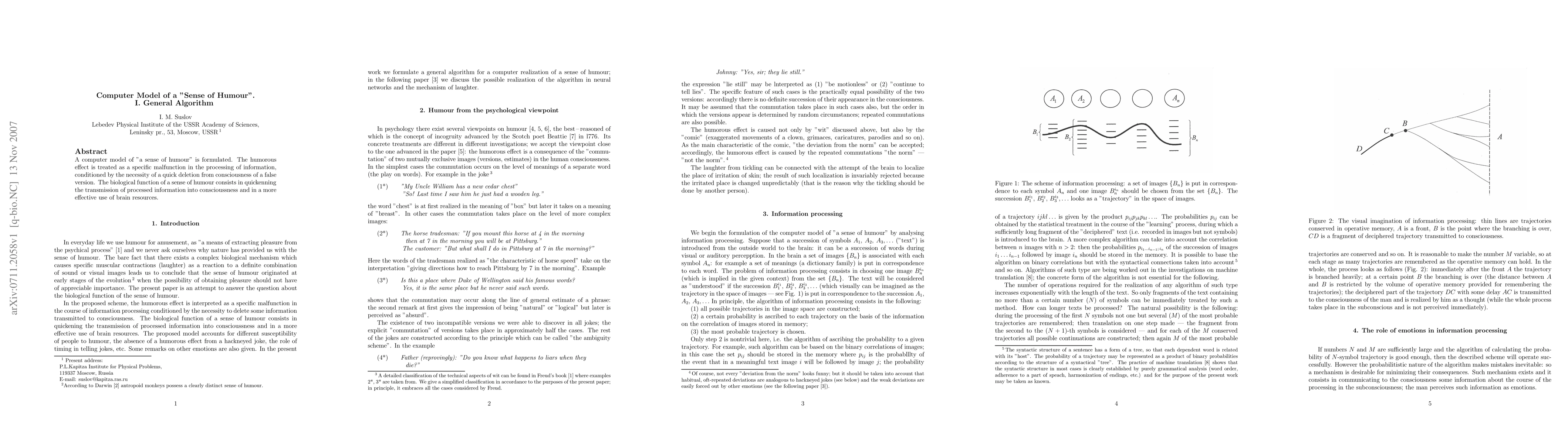 This paper proposes a computer model for a "sense of humour," interpreting humor as a rapid information processing malfunction that facilitates the swift elimination of incorrect information, thereby enhancing brain resource utilization. The biological role of humor is to accelerate information integration and maximize cognitive efficiency.