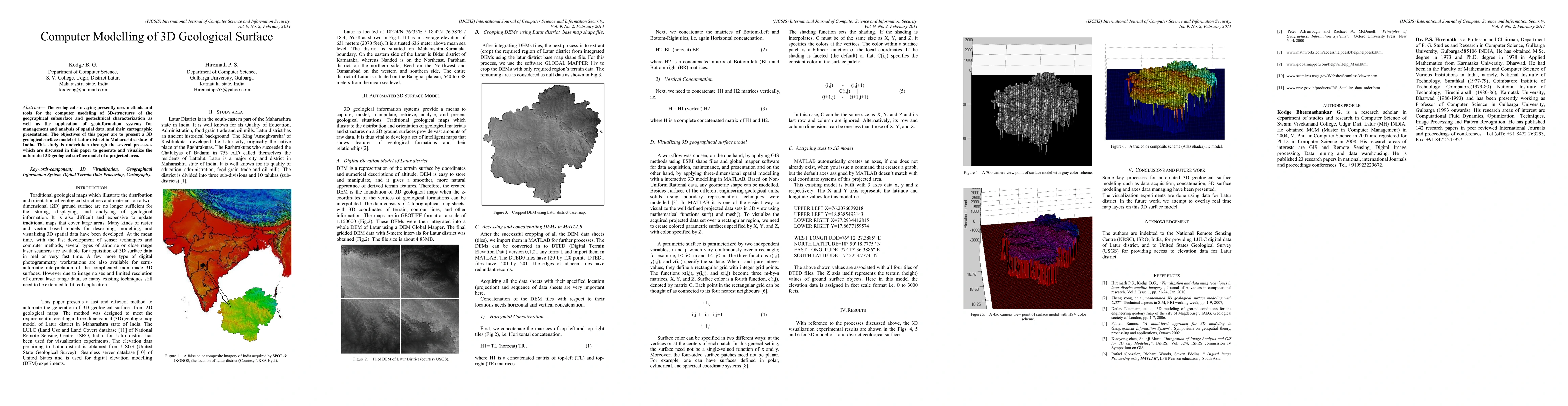 The geological surveying presently uses methods and tools for the computer modeling of 3D-structures of the geographical subsurface and geotechnical characterization as well as the application of geoinformation systems for management and analysis of spatial data, and their cartographic presentation. The objectives of this paper are to present a 3D geological surface model of Latur district in Maharashtra state of India. This study is undertaken through the several processes which are discussed in this paper to generate and visualize the automated 3D geological surface model of a projected area.