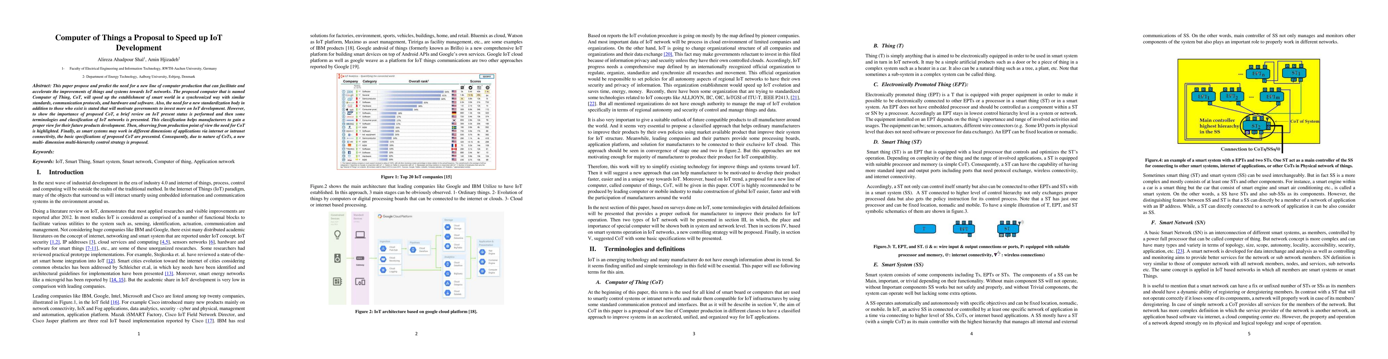 This paper propose and predict the need for a new line of computer production that can facilitate and accelerate the improvements of things and systems towards IoT networks. The proposed computer that is named Computer of Thing, CoT, will speed up the establishment of smart world in a synchronized way with similar standards, communication protocols, and hardware and software. Also, the need for a new standardization body in addition to those who exist is stated that will motivate governments to invest more on IoT development. However, to show the importance of proposed CoT, a brief review on IoT present status is performed and then some terminologies and classification of IoT networks is presented. This classification helps manufacturers to gain a proper view for their future products development. Then, observing from production point of view the need for CoT is highlighted. Finally, as smart systems may work in different dimensions of applications via internet or intranet connectivity, the basic specifications of proposed CoT are presented. Consequently, due to nature of CoTs, a new multi- dimension multi-hierarchy control strategy is proposed.