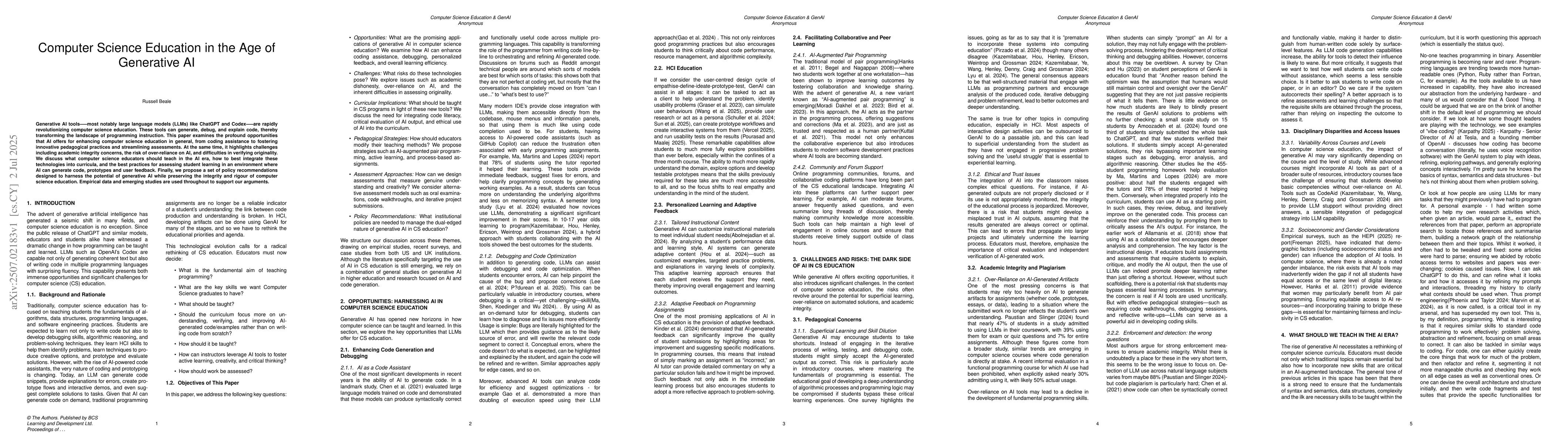 Generative AI tools - most notably large language models (LLMs) like ChatGPT and Codex - are rapidly revolutionizing computer science education. These tools can generate, debug, and explain code, thereby transforming the landscape of programming instruction. This paper examines the profound opportunities that AI offers for enhancing computer science education in general, from coding assistance to fostering innovative pedagogical practices and streamlining assessments. At the same time, it highlights challenges including academic integrity concerns, the risk of over-reliance on AI, and difficulties in verifying originality. We discuss what computer science educators should teach in the AI era, how to best integrate these technologies into curricula, and the best practices for assessing student learning in an environment where AI can generate code, prototypes and user feedback. Finally, we propose a set of policy recommendations designed to harness the potential of generative AI while preserving the integrity and rigour of computer science education. Empirical data and emerging studies are used throughout to support our arguments.