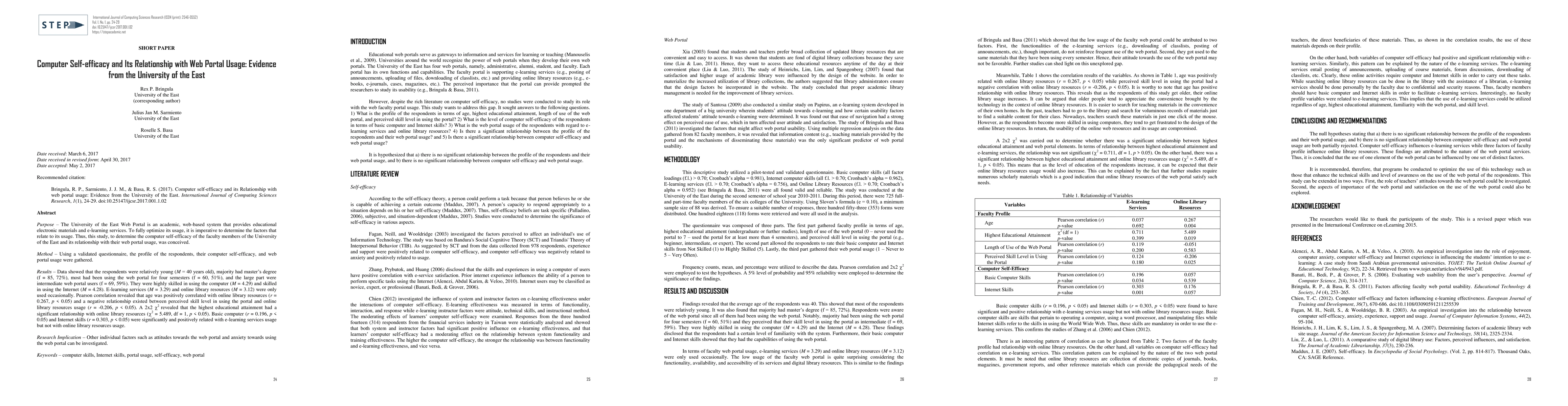 This study examines the computer self-efficacy of University of the East faculty members and its correlation with their usage of the university's web portal. Results indicate a significant positive relationship between basic computer and Internet skills and e-learning services usage, while online library resources usage was negatively correlated with perceived skill level in using the portal.