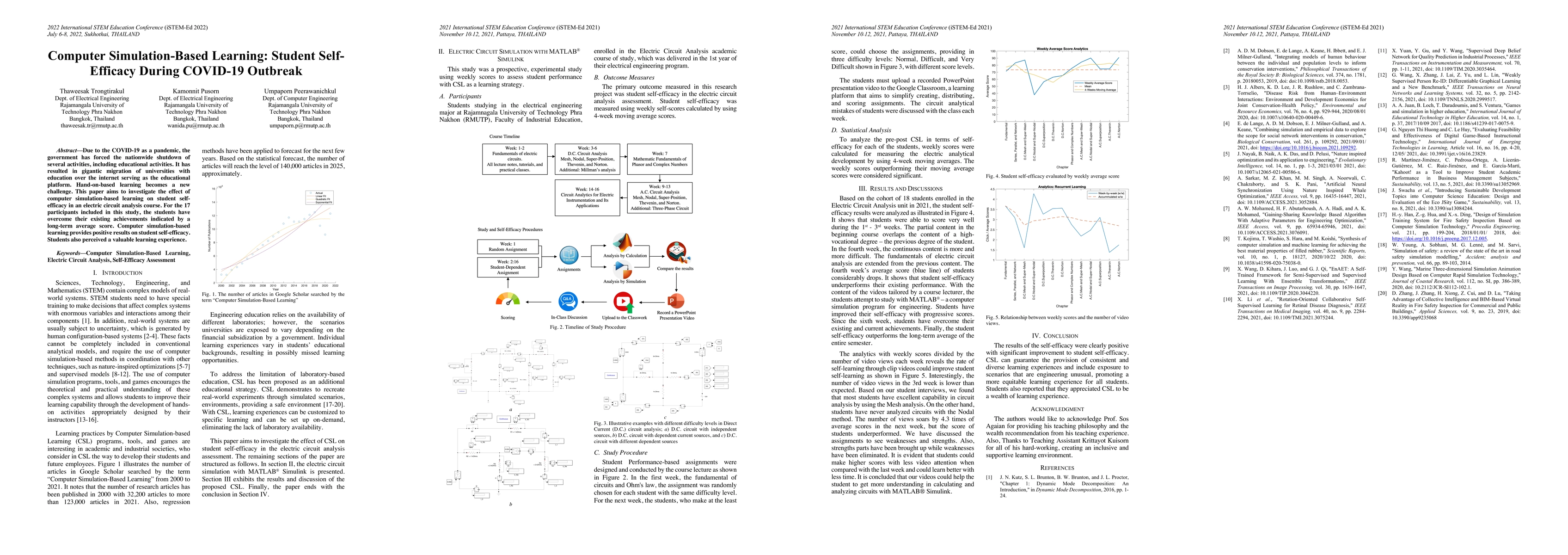 This study examines the impact of computer simulation-based learning on student self-efficacy during the COVID-19 pandemic, finding that it enhances self-efficacy and provides a valuable learning experience in an electric circuit analysis course. The results indicate that students outperformed their long-term average scores.