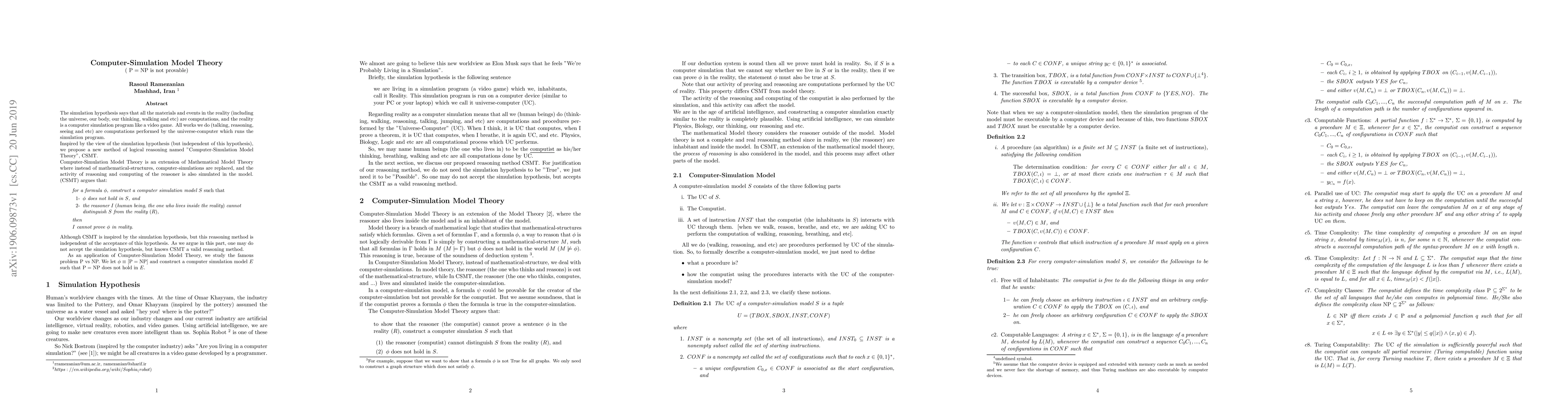 The simulation hypothesis says that all the materials and events in the reality (including the universe, our body, our thinking, walking and etc) are computations, and the reality is a computer simulation program like a video game. All works we do (talking, reasoning, seeing and etc) are computations performed by the universe-computer which runs the simulation program. Inspired by the view of the simulation hypothesis (but independent of this hypothesis), we propose a new method of logical reasoning named "Computer-Simulation Model Theory", CSMT. Computer-Simulation Model Theory is an extension of Mathematical Model Theory where instead of mathematical-structures, computer-simulations are replaced, and the activity of reasoning and computing of the reasoner is also simulated in the model. (CSMT) argues that: For a formula $\phi$, construct a computer simulation model $S$, such that 1- $\phi$ does not hold in $S$, and 2- the reasoner $I$ $($human being, the one who lives inside the reality$)$ cannot distinguish $S$ from the reality $(R)$, then $I$ cannot prove $\phi$ in reality. Although $\mathrm{CSMT}$ is inspired by the simulation hypothesis, but this reasoning method is independent of the acceptance of this hypothesis. As we argue in this part, one may do not accept the simulation hypothesis, but knows $\mathrm{CSMT}$ a valid reasoning method. As an application of Computer-Simulation Model Theory, we study the famous problem P vs NP. We let $\phi \equiv\mathrm{ [P= NP]} $ and construct a computer simulation model $E$ such that $\mathrm{P= NP}$ does not hold in $E$.