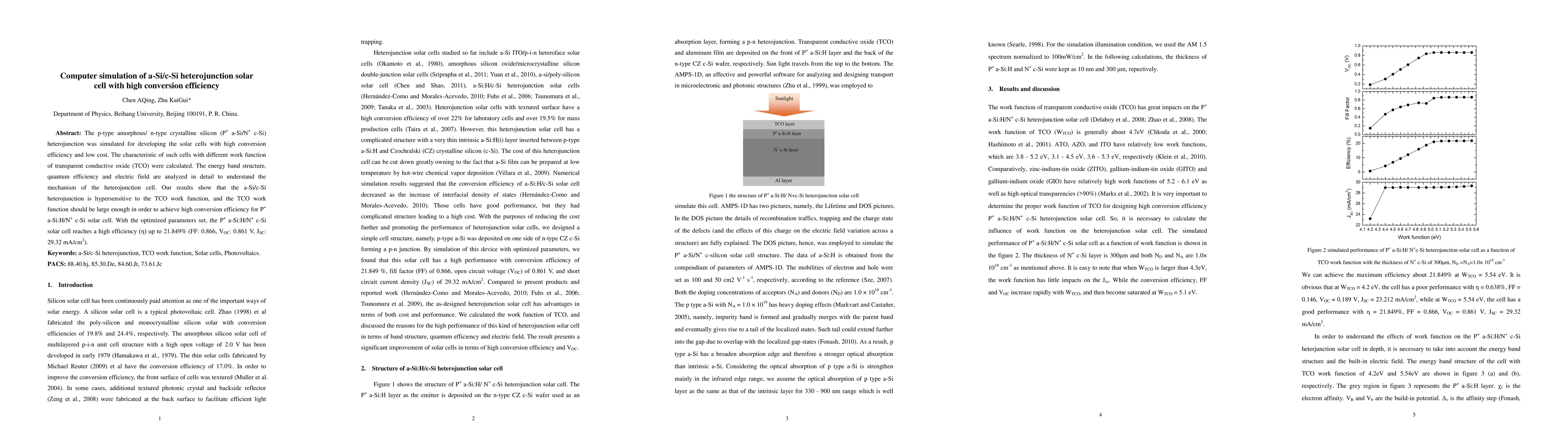 This paper simulates a P+ a-Si/N+ c-Si heterojunction solar cell to achieve high conversion efficiency and low cost. The study reveals that the TCO work function significantly impacts efficiency, with an optimal configuration reaching a high efficiency of 21.849%.