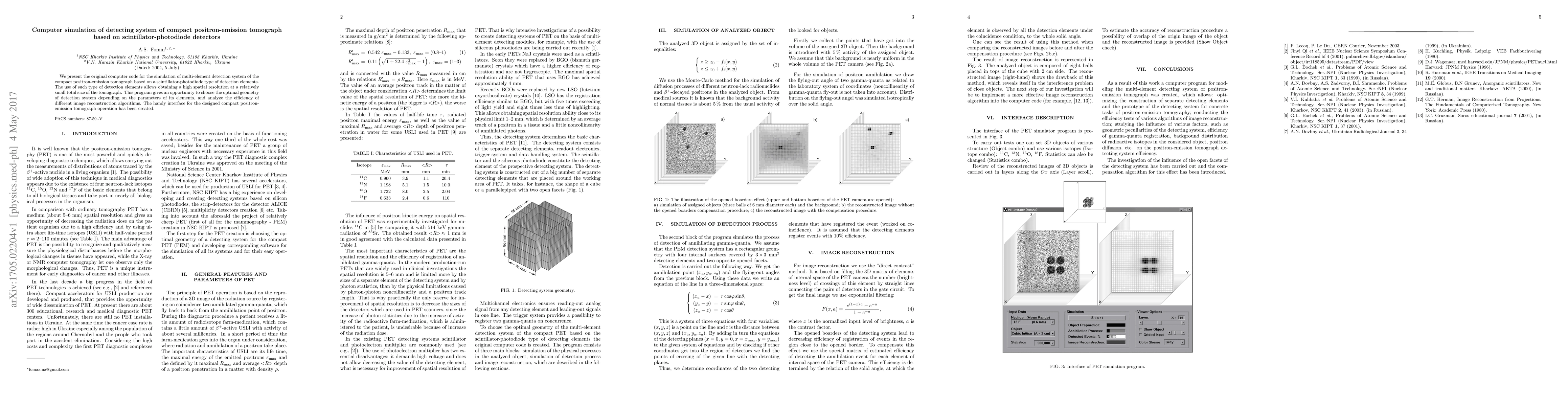 We present the original computer code for the simulation of multi-element detection system of the compact positron-emission tomograph based on a scintillator-photodiode type of detection elements. The use of such type of detection elements allows obtaining a high spatial resolution at a relatively small total size of the tomograph. This program gives an opportunity to choose the optimal geometry of detection system depending on the parameters of its elements, and analyze the efficiency of different image reconstruction algorithms. The handy interface for the designed compact positron-emission tomograph operation has been created.