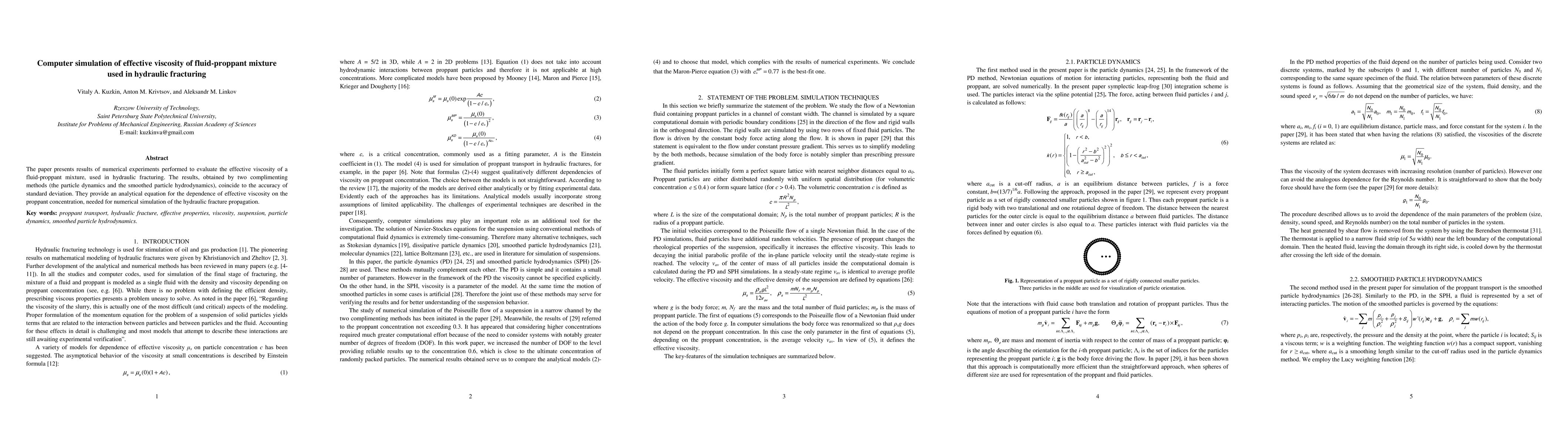 This paper reports numerical experiments using particle dynamics and smoothed particle hydrodynamics to evaluate the effective viscosity of fluid-proppant mixtures in hydraulic fracturing. The results from both methods align closely, providing an analytical equation for effective viscosity based on proppant concentration for simulating fracture propagation.