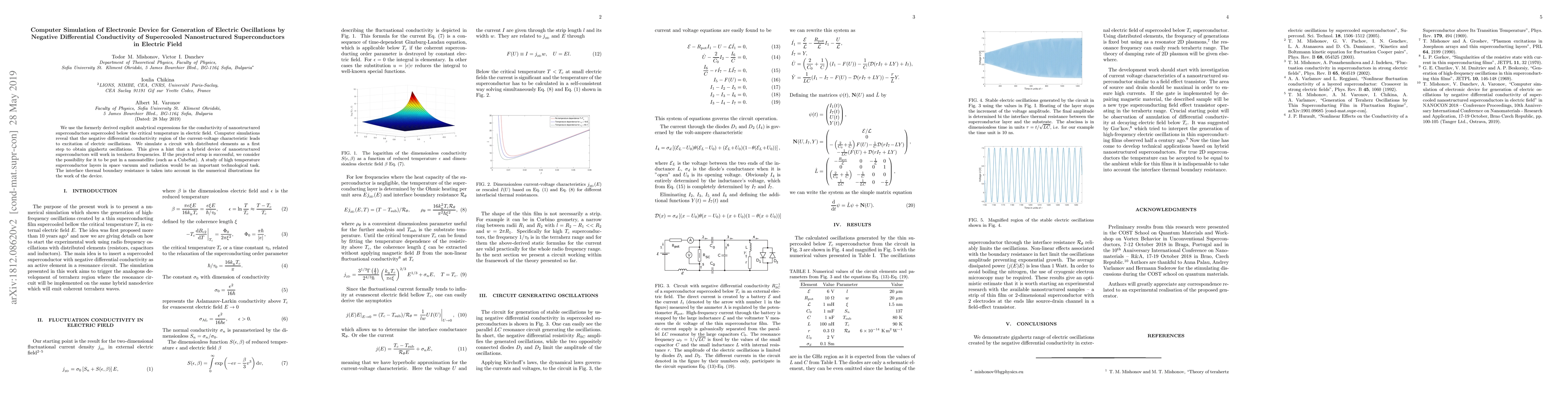 We use the formerly derived explicit analytical expressions for the conductivity of nanostructured superconductors supercooled below the critical temperature in electric field. Computer simulations reveal that the negative differential conductivity region of the current-voltage characteristic leads to excitation of electric oscillations. We simulate a circuit with distributed elements as a first step to obtain gigahertz oscillations. This gives a hint that a hybrid device of nanostructured superconductors will work in terahertz frequencies. If the projected setup is successful, we consider the possibility for it to be put in a nanosatellite (such as a CubeSat). A study of high temperature superconductor layers in space vacuum and radiation would be an important technological task. The interface thermal boundary resistance is taken into account in the numerical illustrations for the work of the device.