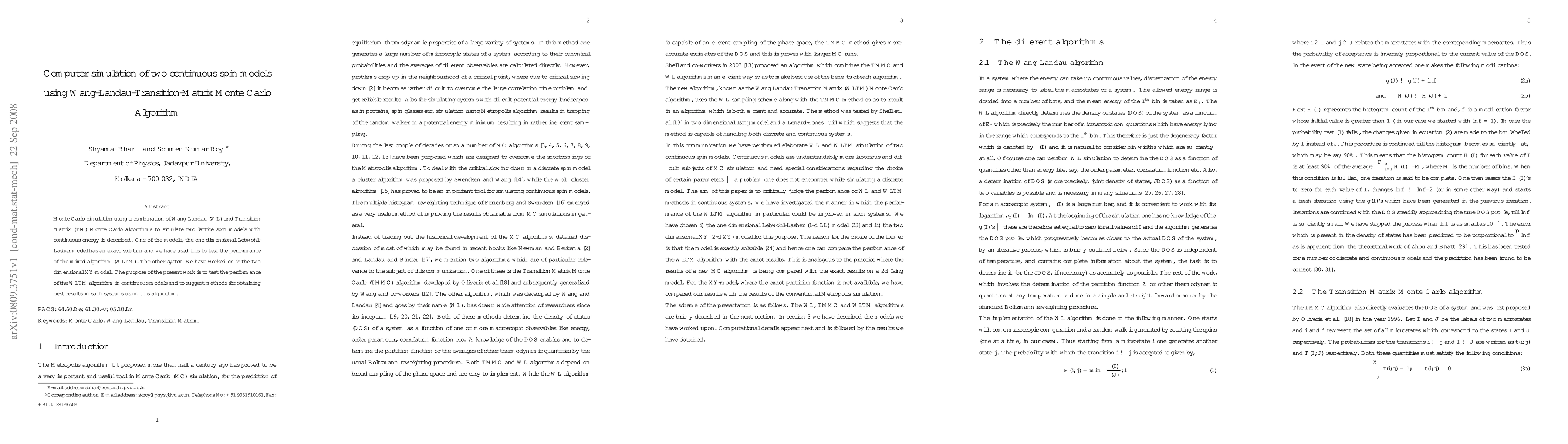This paper presents a Monte Carlo simulation combining Wang-Landau and Transition Matrix algorithms to study two continuous spin models: the 1D Lebwohl-Lasher model and the 2D XY-model. The study aims to evaluate the effectiveness of the hybrid WLTM algorithm in continuous systems and proposes methods for optimizing its performance.