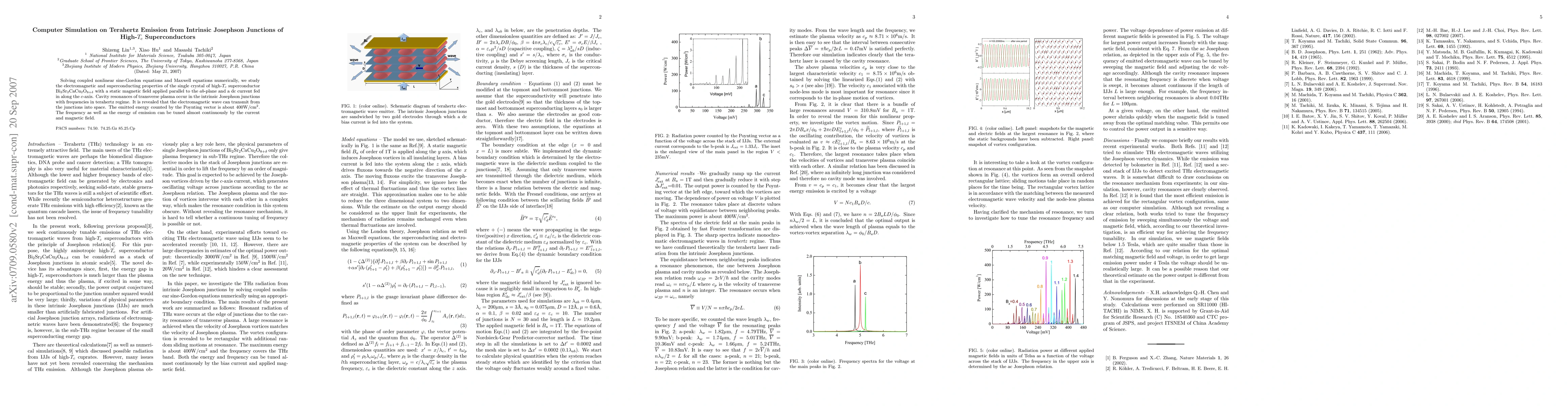 This paper investigates the terahertz emission from intrinsic Josephson junctions in high-$T_c$ superconductors using numerical simulations of coupled nonlinear sine-Gordon and Maxwell equations. The study reveals that the junctions can emit electromagnetic waves with tunable frequency and energy, reaching up to $400\rm{W/cm^2}$, influenced by applied current and magnetic field.